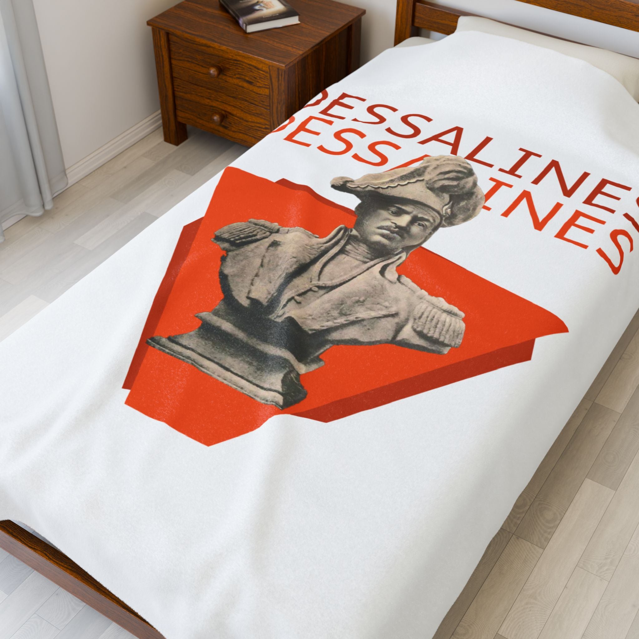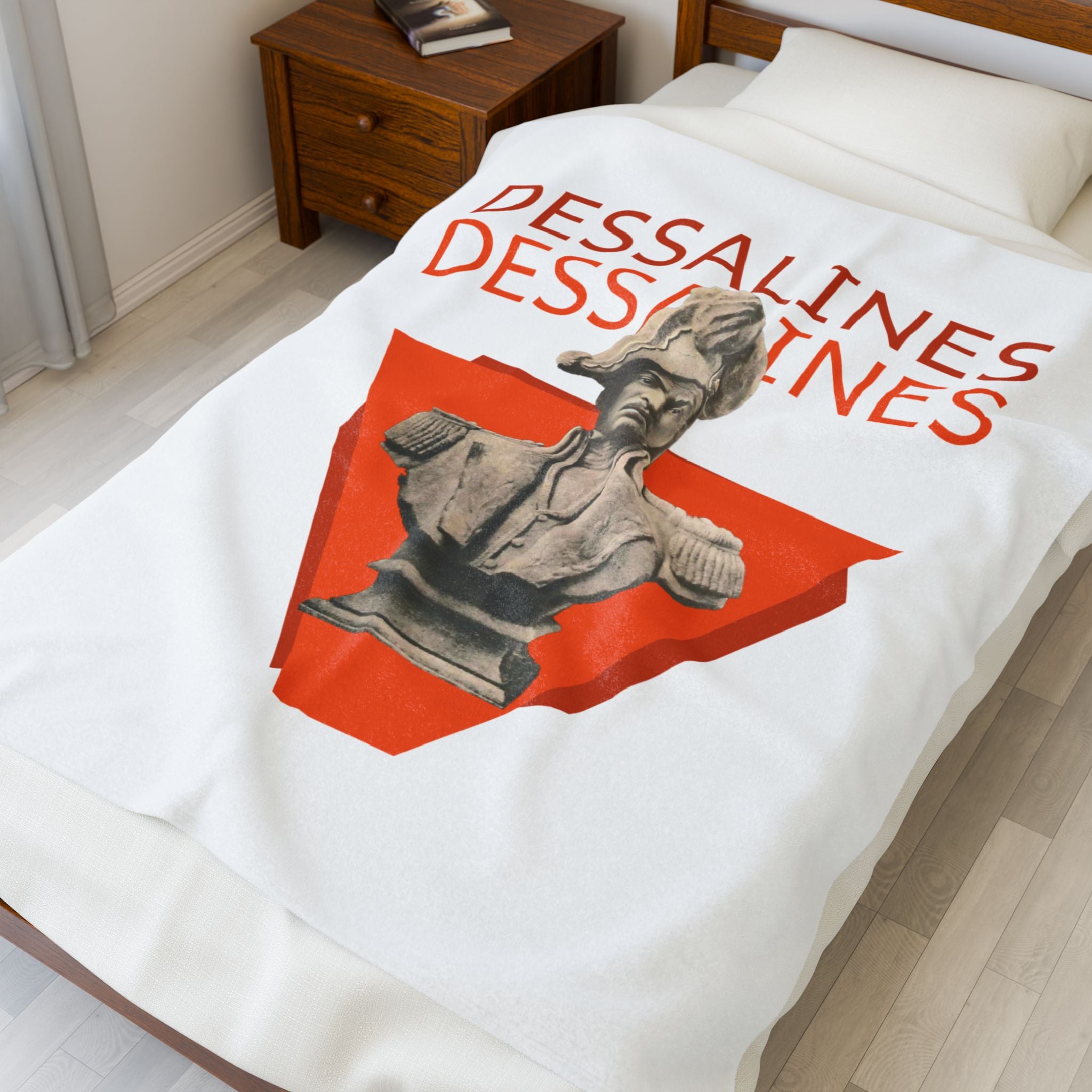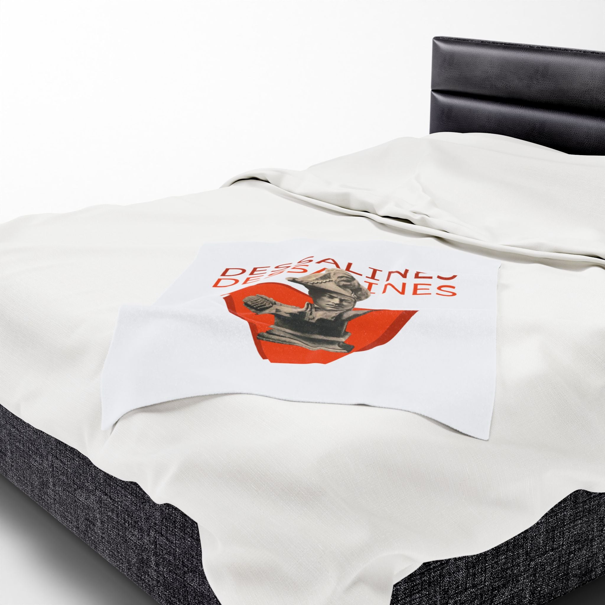 This powerful velveteen throw captures the defiant energy of Jean-Jacques Dessalines — founding father of Haiti and fierce architect of Black liberation. Centered on a concrete bust rising from a bold red triangle, the design echoes with historical weight and raw power. The repeated name “Dessalines” in vivid type reasserts the authority of a legacy that refuses erasure.