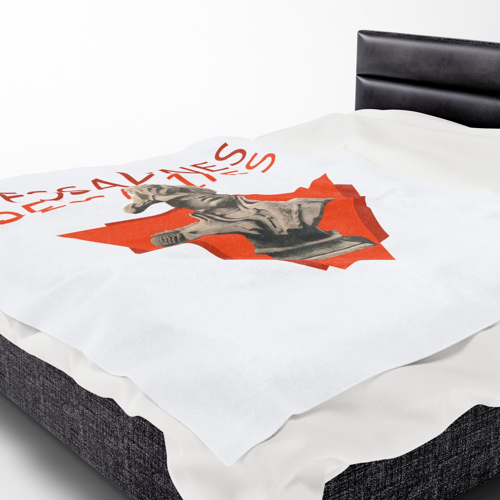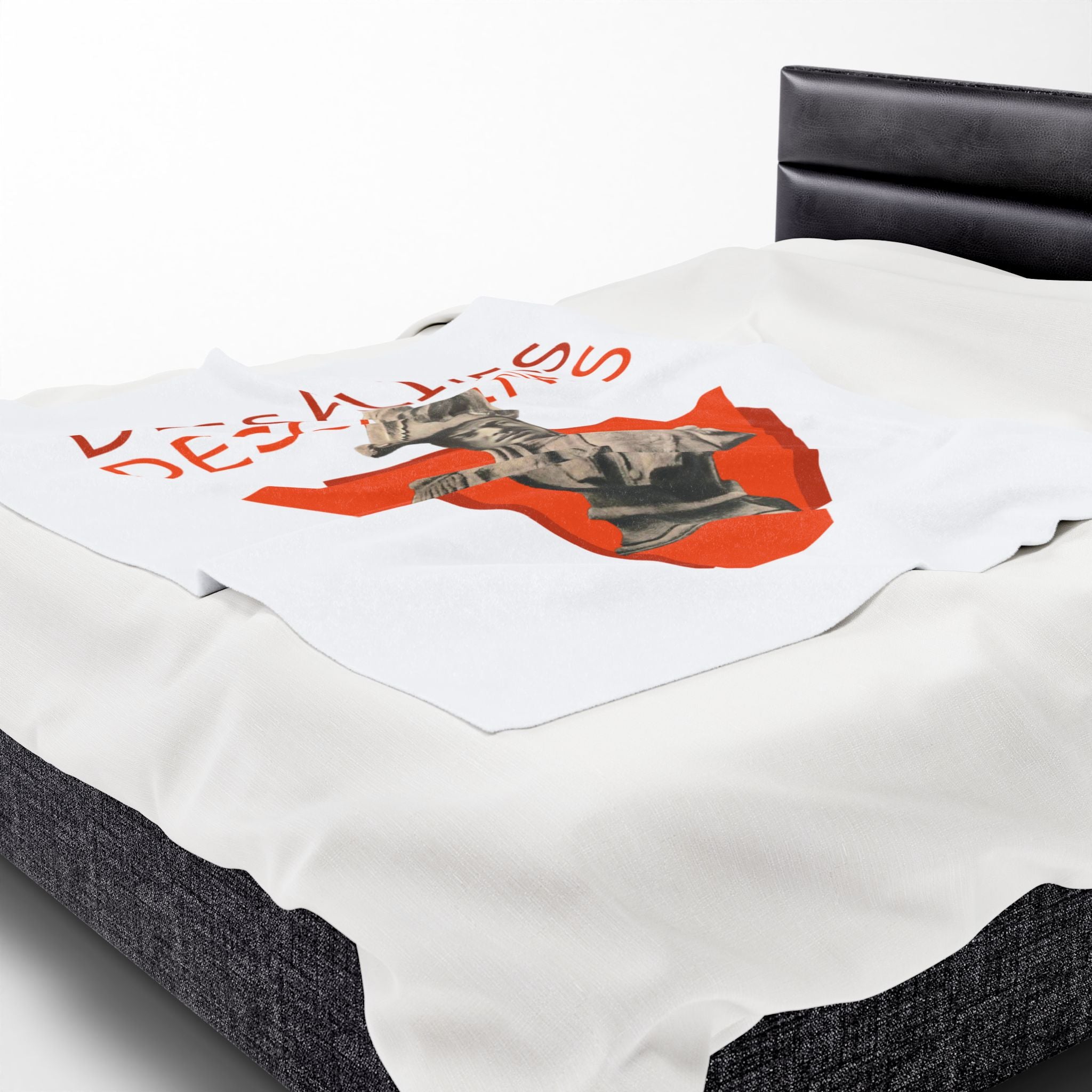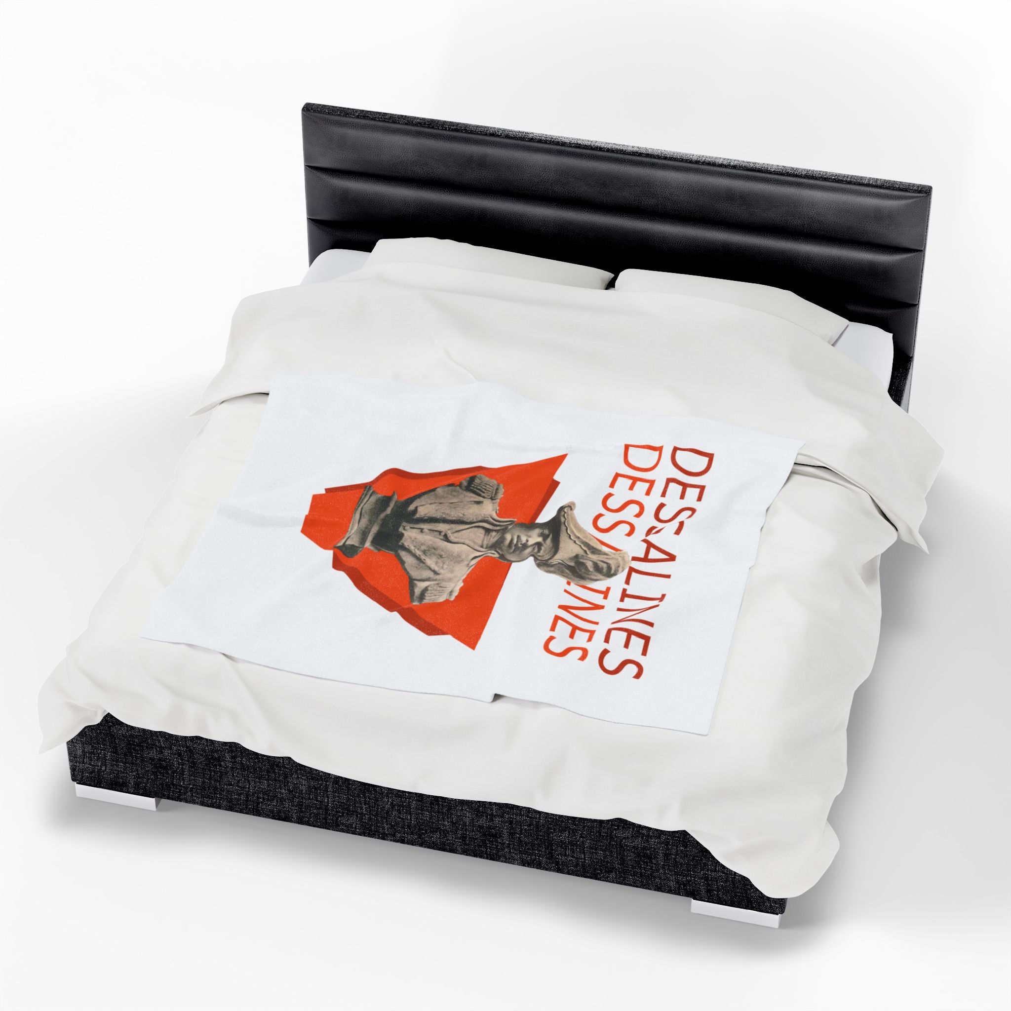 This powerful velveteen throw captures the defiant energy of Jean-Jacques Dessalines — founding father of Haiti and fierce architect of Black liberation. Centered on a concrete bust rising from a bold red triangle, the design echoes with historical weight and raw power. The repeated name “Dessalines” in vivid type reasserts the authority of a legacy that refuses erasure.