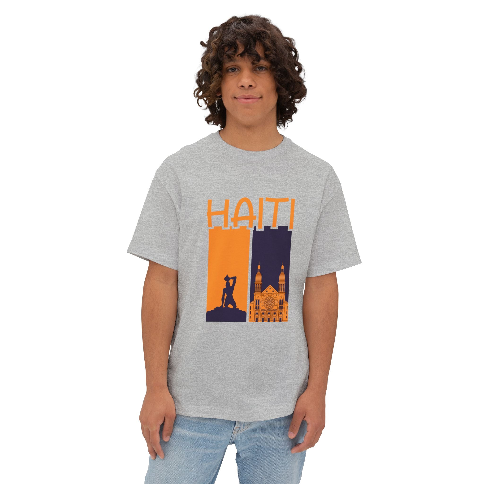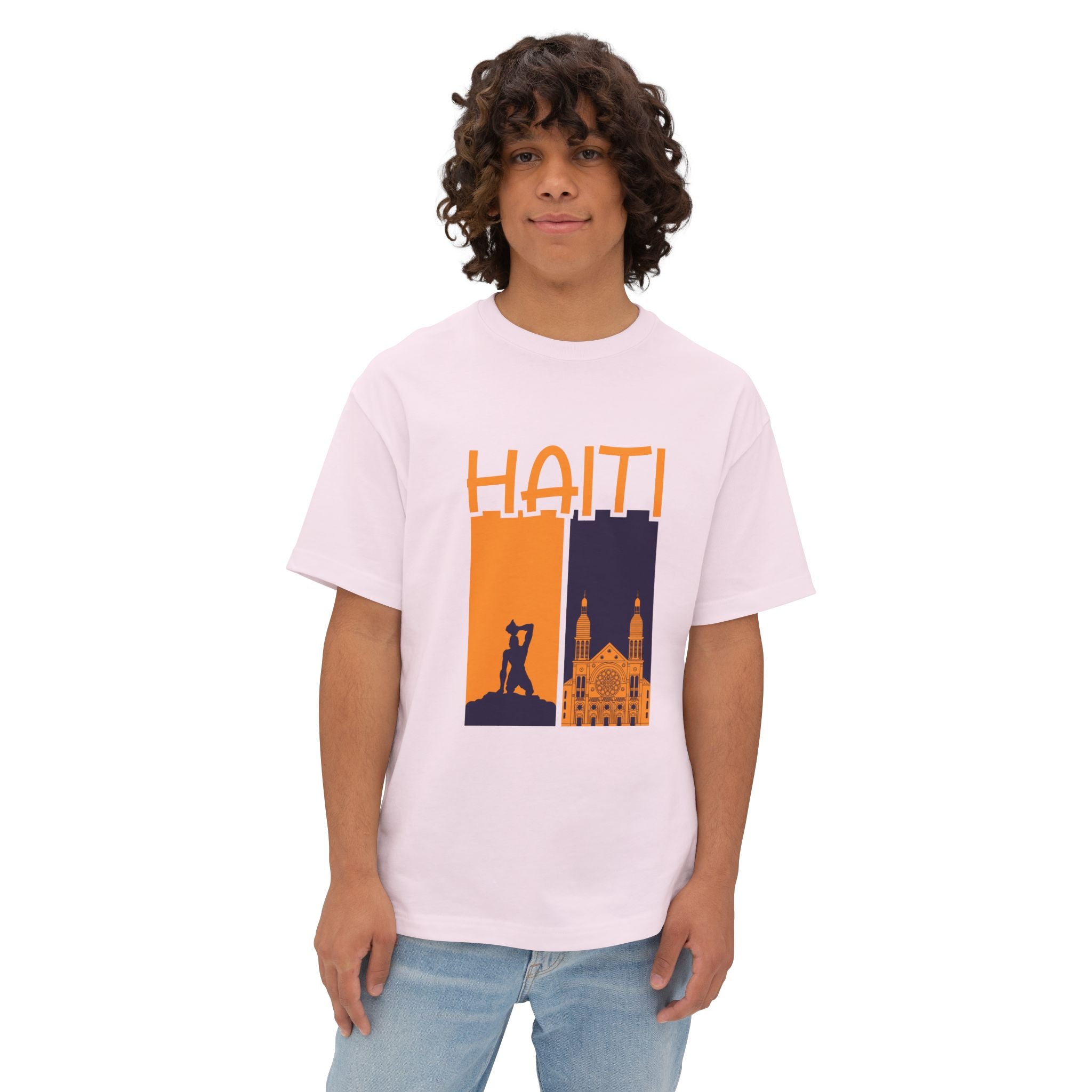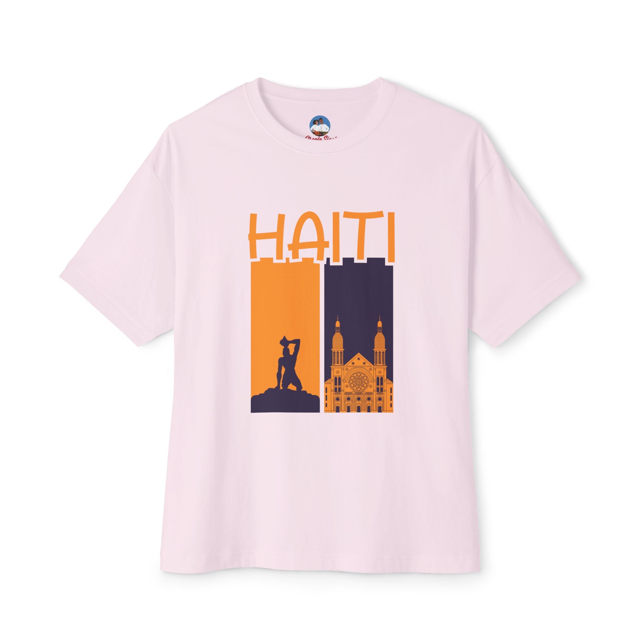 This bold unisex oversized tee fuses iconic Haitian symbolism with modern streetwear appeal. Rendered in vibrant shades of yellow, orange, and deep purple, the graphic brings together two enduring emblems: the Negre Marron — the kneeling freedom fighter — and the silhouette of a cathedral skyline. Together, they represent Haiti’s spiritual and revolutionary heartbeat: one fist raised, one knee grounded in faith.