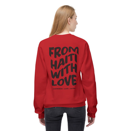 Wrap yourself in warmth and heritage with this Unisex Midweight Fleece Crewneck Sweatshirt, designed for comfort, style, and meaningful expression. Featuring the heartfelt graphic “From Haiti, With Love” framed like a nostalgic postcard, this sweatshirt blends romance, nostalgia, and cultural pride into a versatile wardrobe staple.