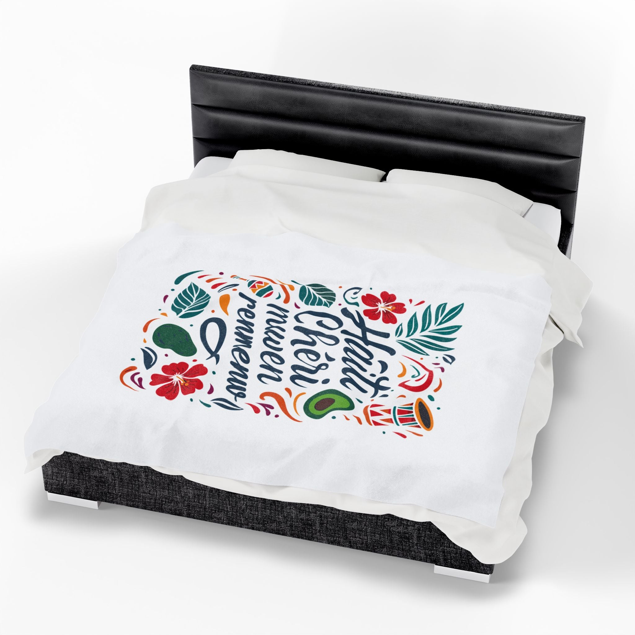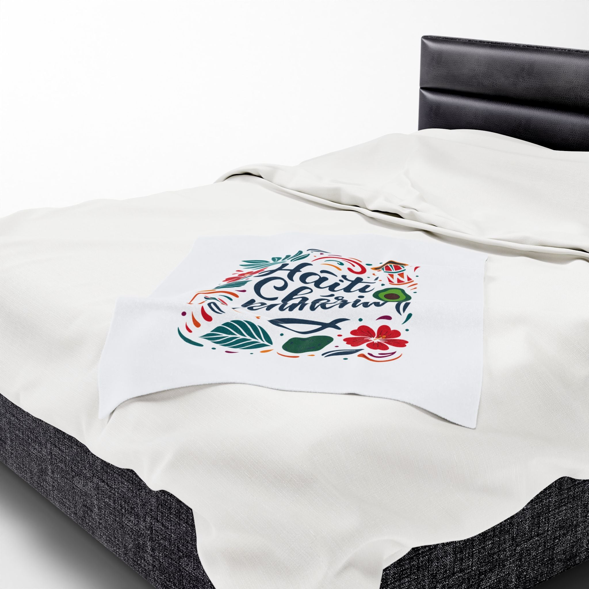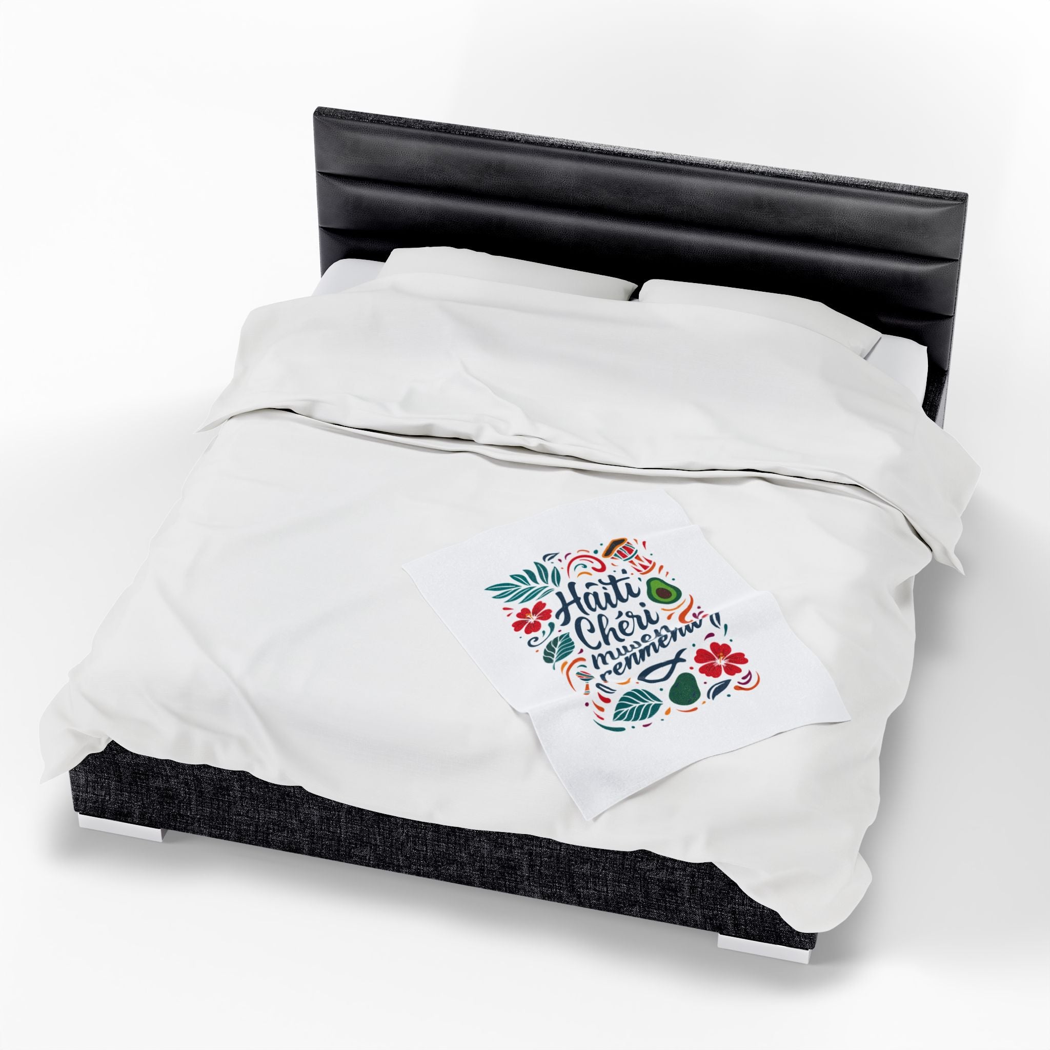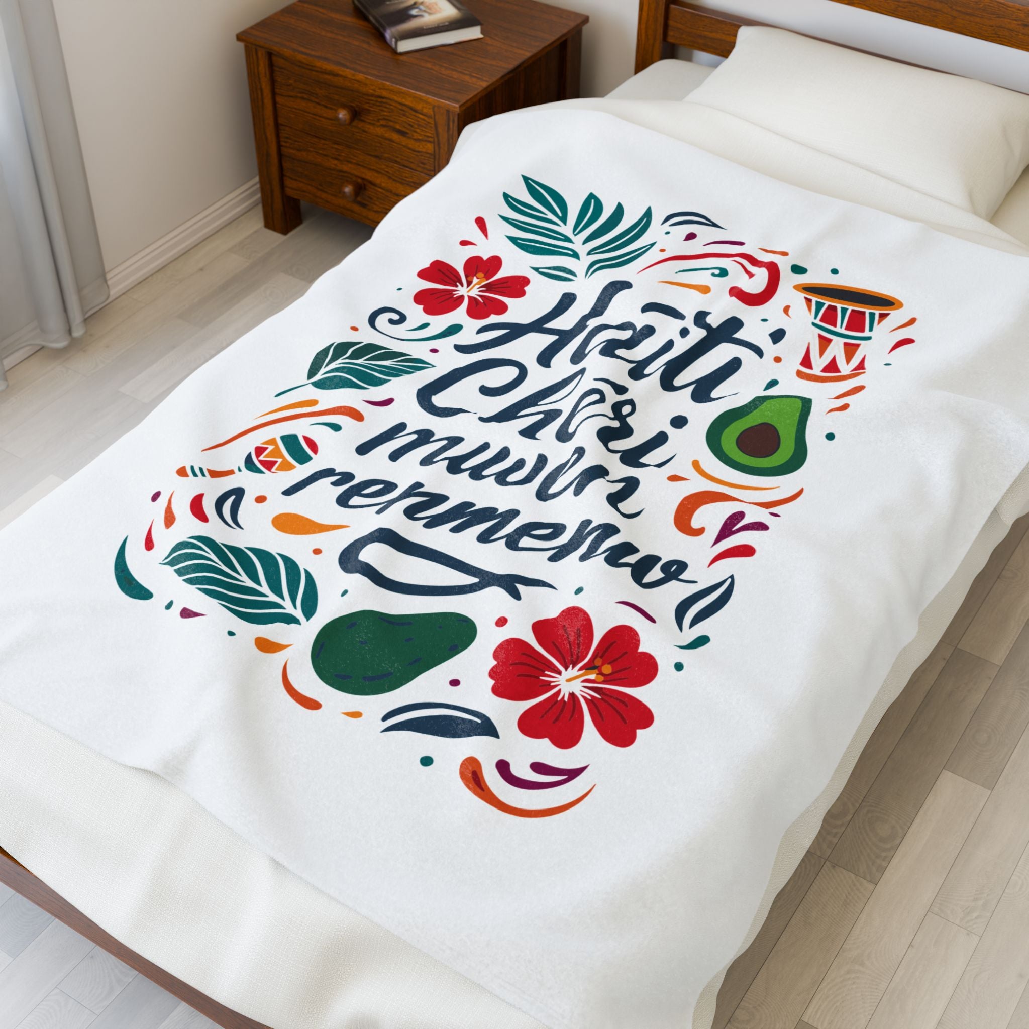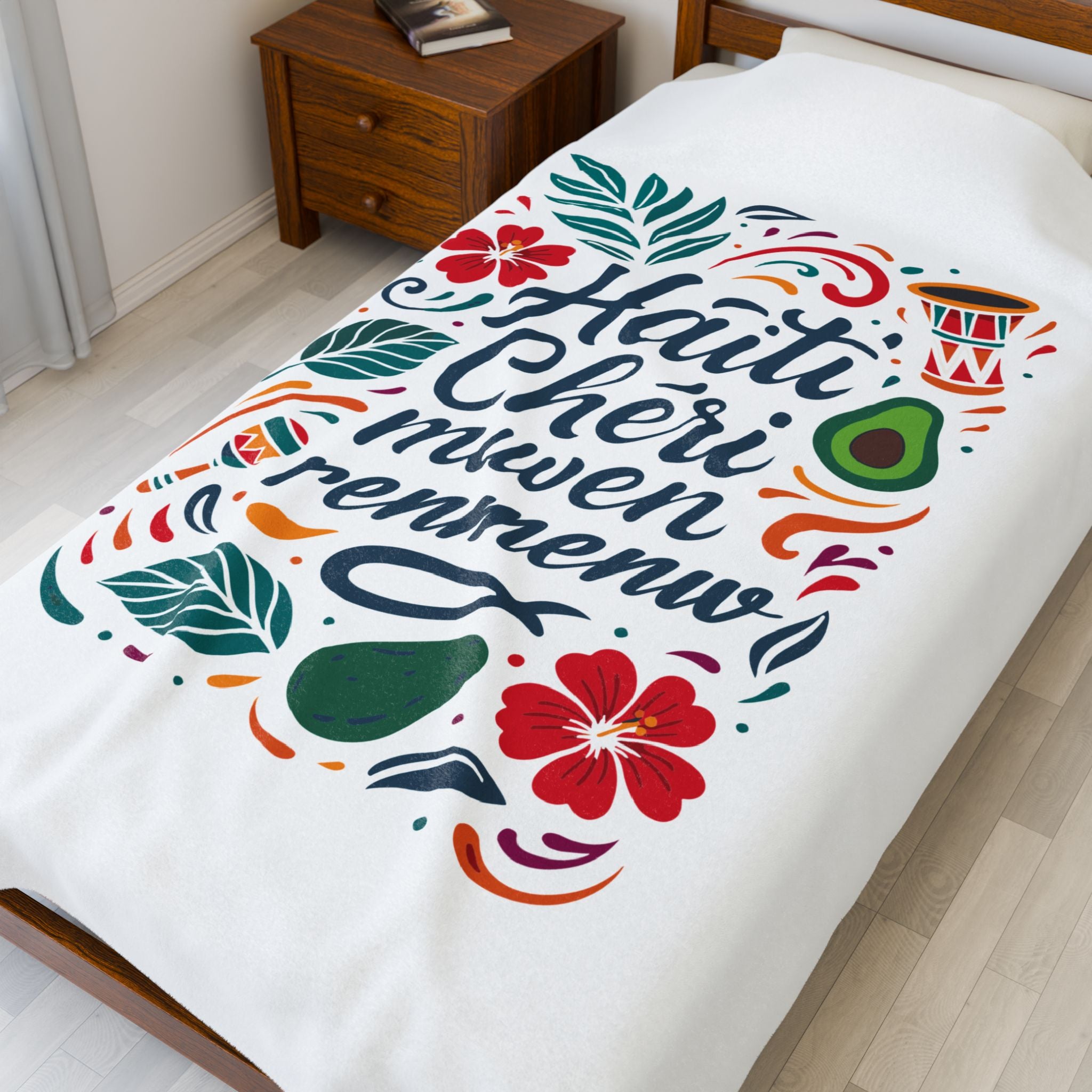 The “Haiti Chéri Mwen Renmenw” plush blanket is a vibrant embrace of homeland pride. Translating to “Dear Haiti, I love you”, it’s one of the most heartfelt phrases in Haitian culture — spoken across generations, sung in folk songs, and whispered in the hearts of those living abroad.