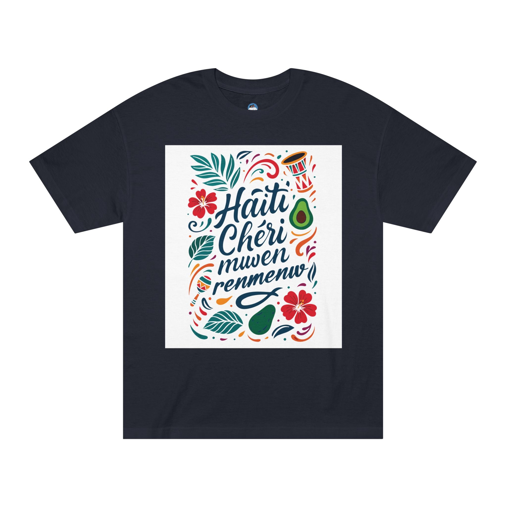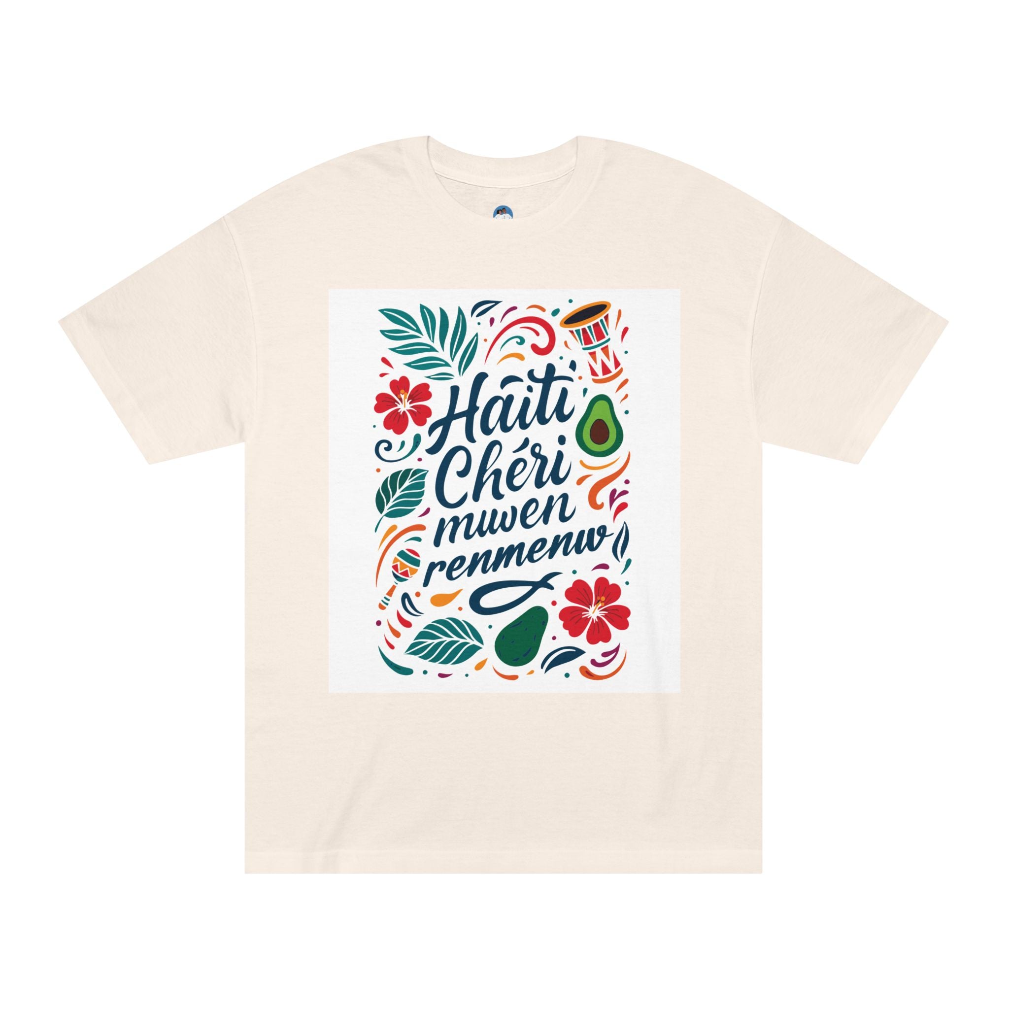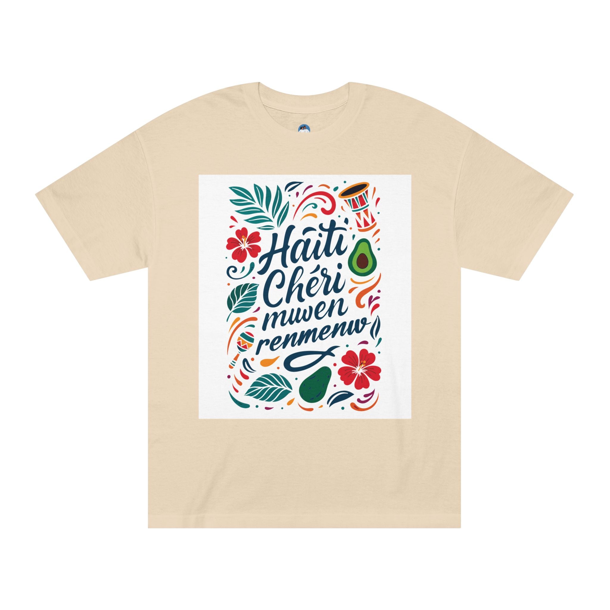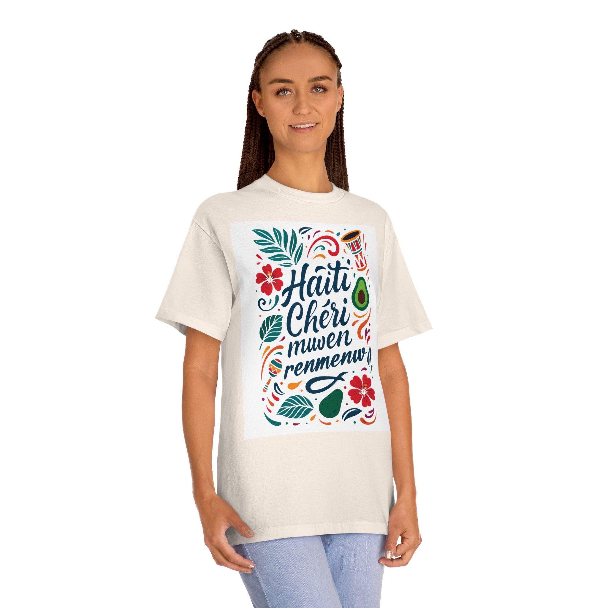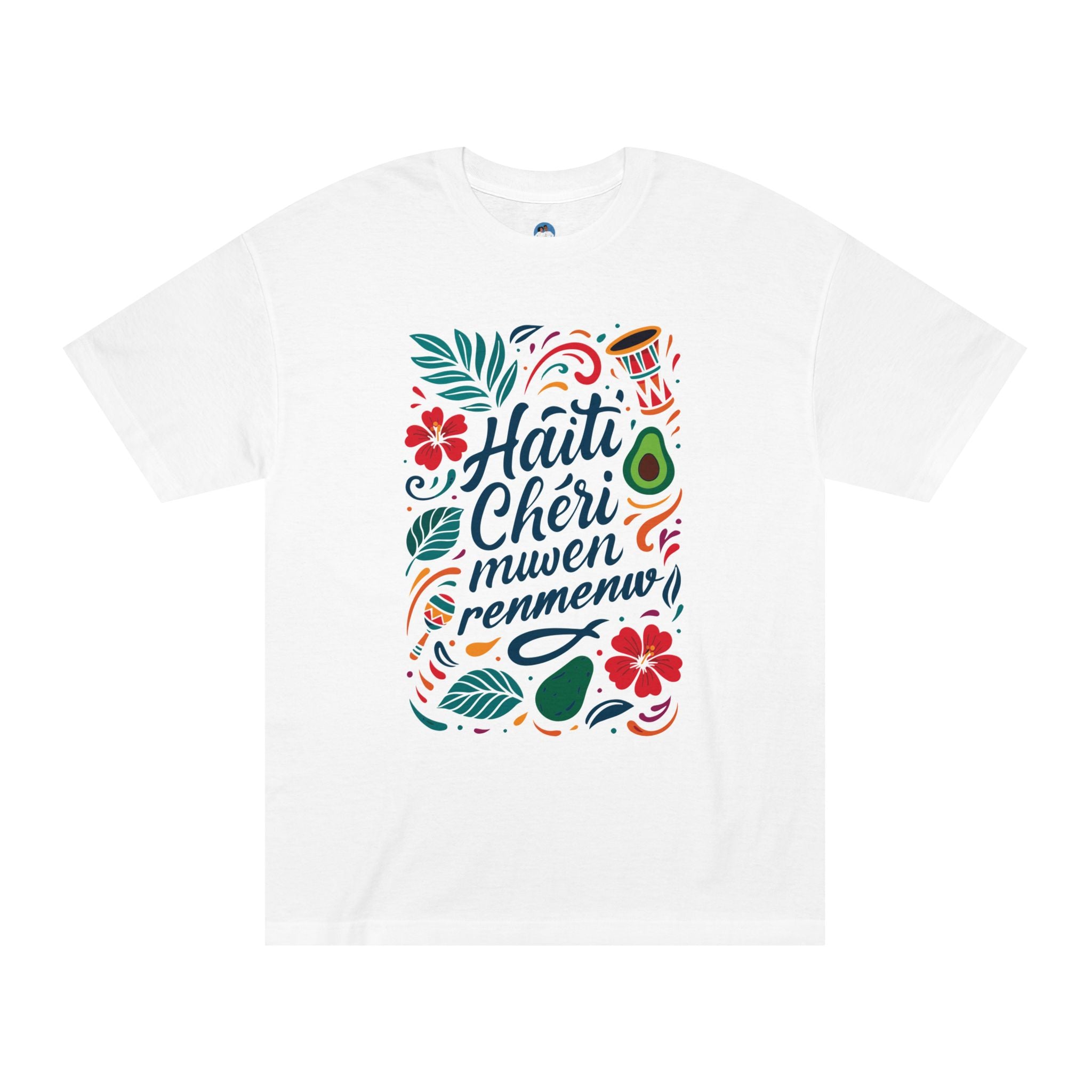 This vibrant, hand-lettered design is a love letter in motion — the beloved Creole phrase “Haiti Chéri Mwen Renmenw” (“Dear Haiti, I love you”) surrounded by bursts of hibiscus blooms, tropical leaves, and the rhythm of traditional Haitian instruments. It’s a joyful declaration of cultural devotion, perfect for the diaspora and second-generation youth who carry Haiti in their soul.