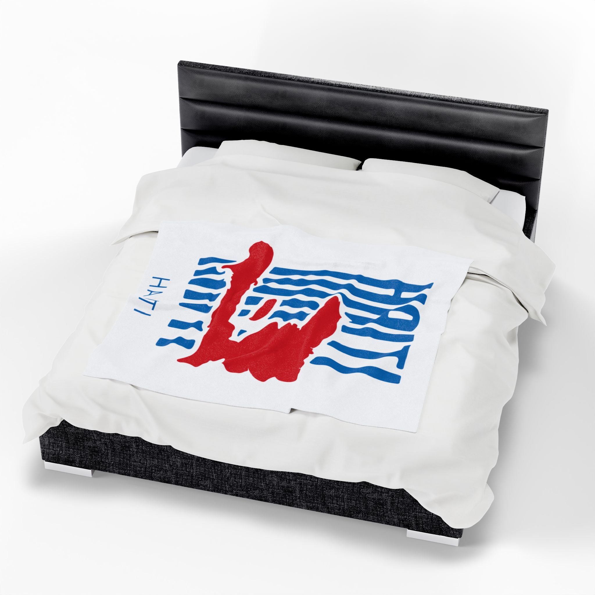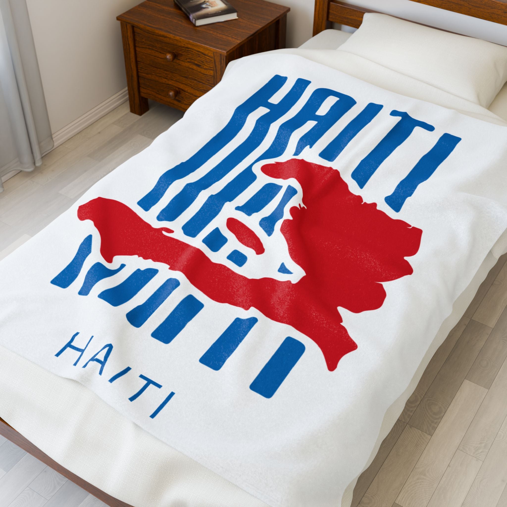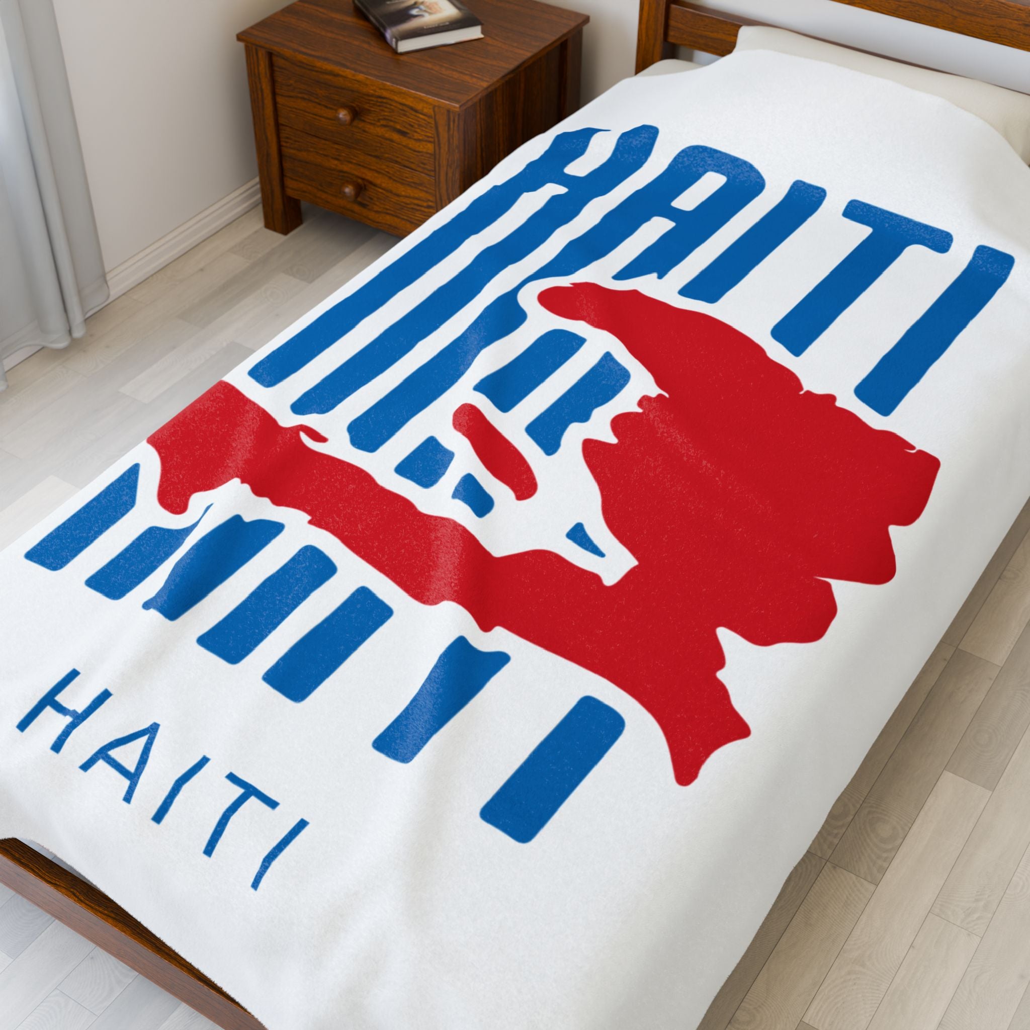 This plush blanket features a clean, vertical graphic with powerful blue stripes and a solid red silhouette of Haiti, paired with the word “HAITI” in a striking uppercase font. The design has the sharp, official feel of a passport stamp or modern identity badge, symbolizing presence, belonging, and unapologetic representation.