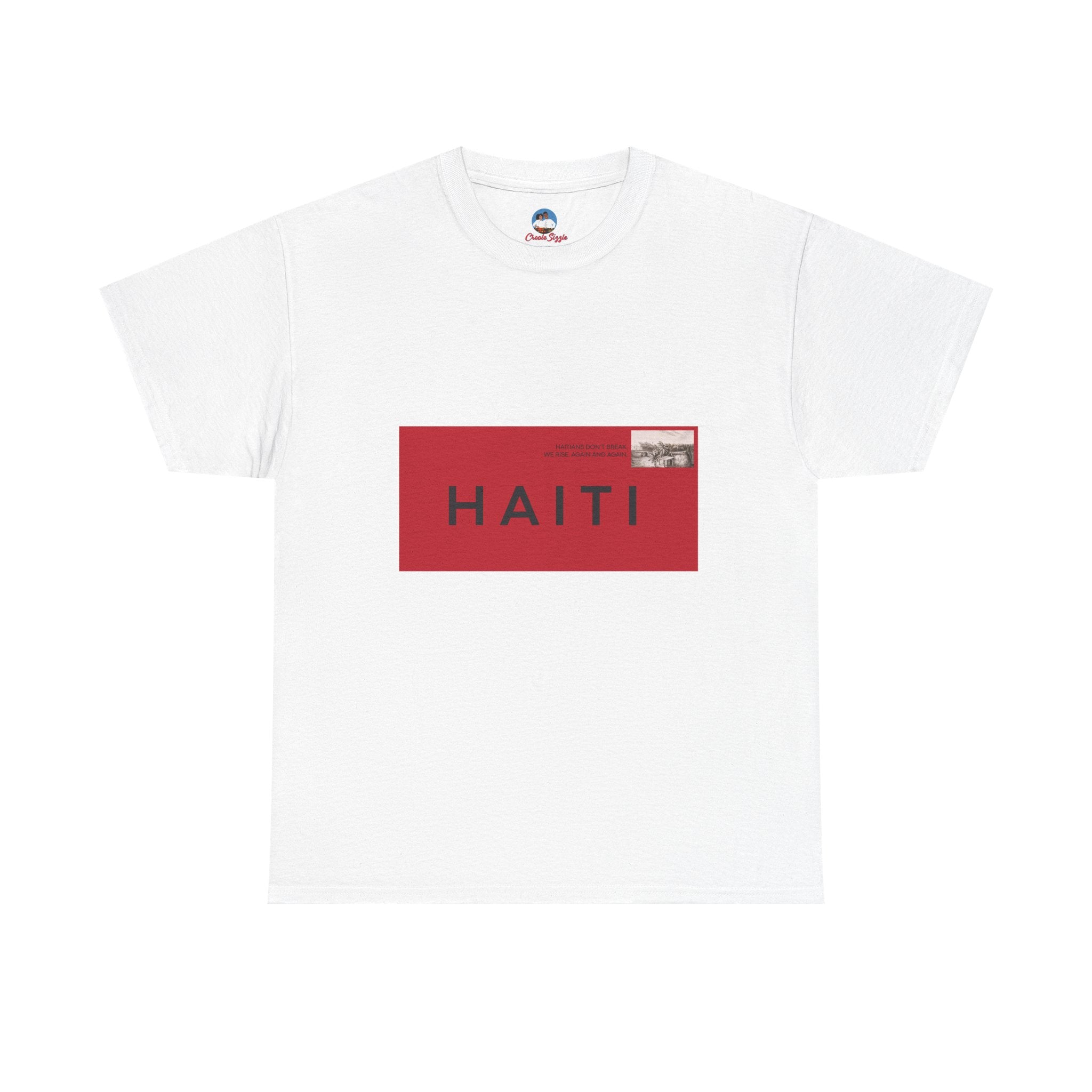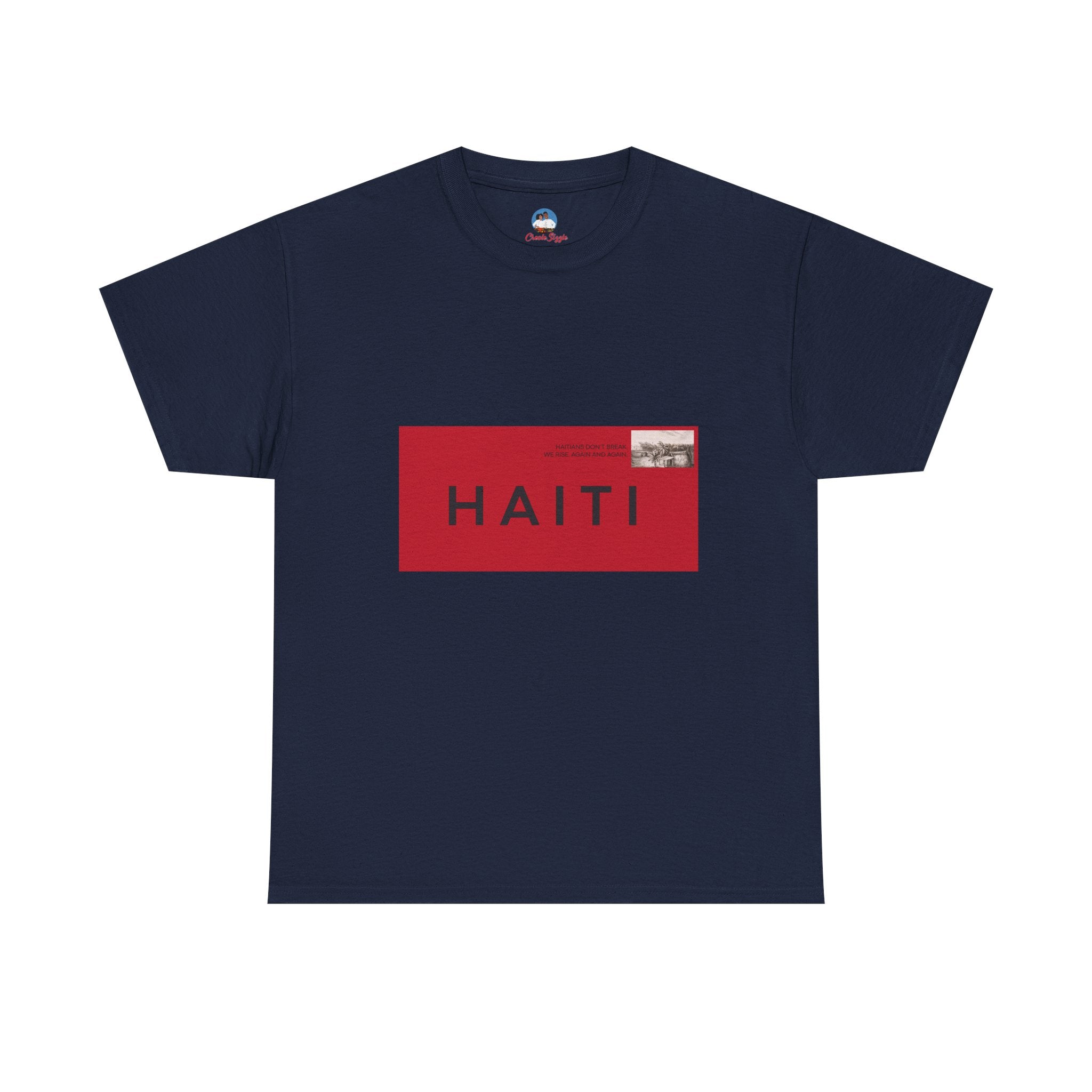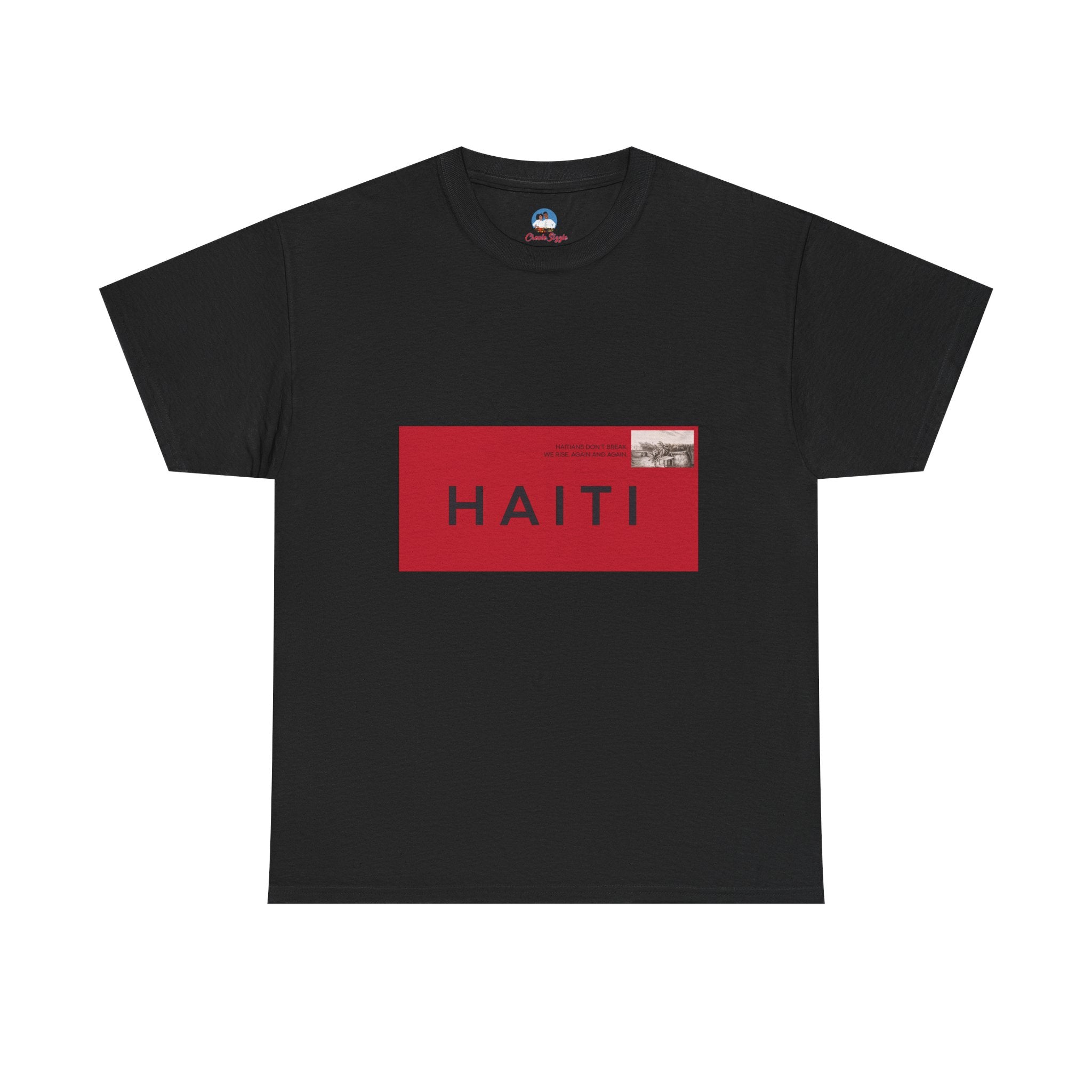 Bold, graphic, and unapologetic — this tee transforms Haiti into a seal of origin. The red-and-black postage stamp design is crisp and modern, yet rooted in nostalgia, evoking the letters, care packages, and love sent across oceans. For the Haitian diaspora, it’s a wearable passport stamp — a reminder that no matter where you are, Haiti is stamped on you.