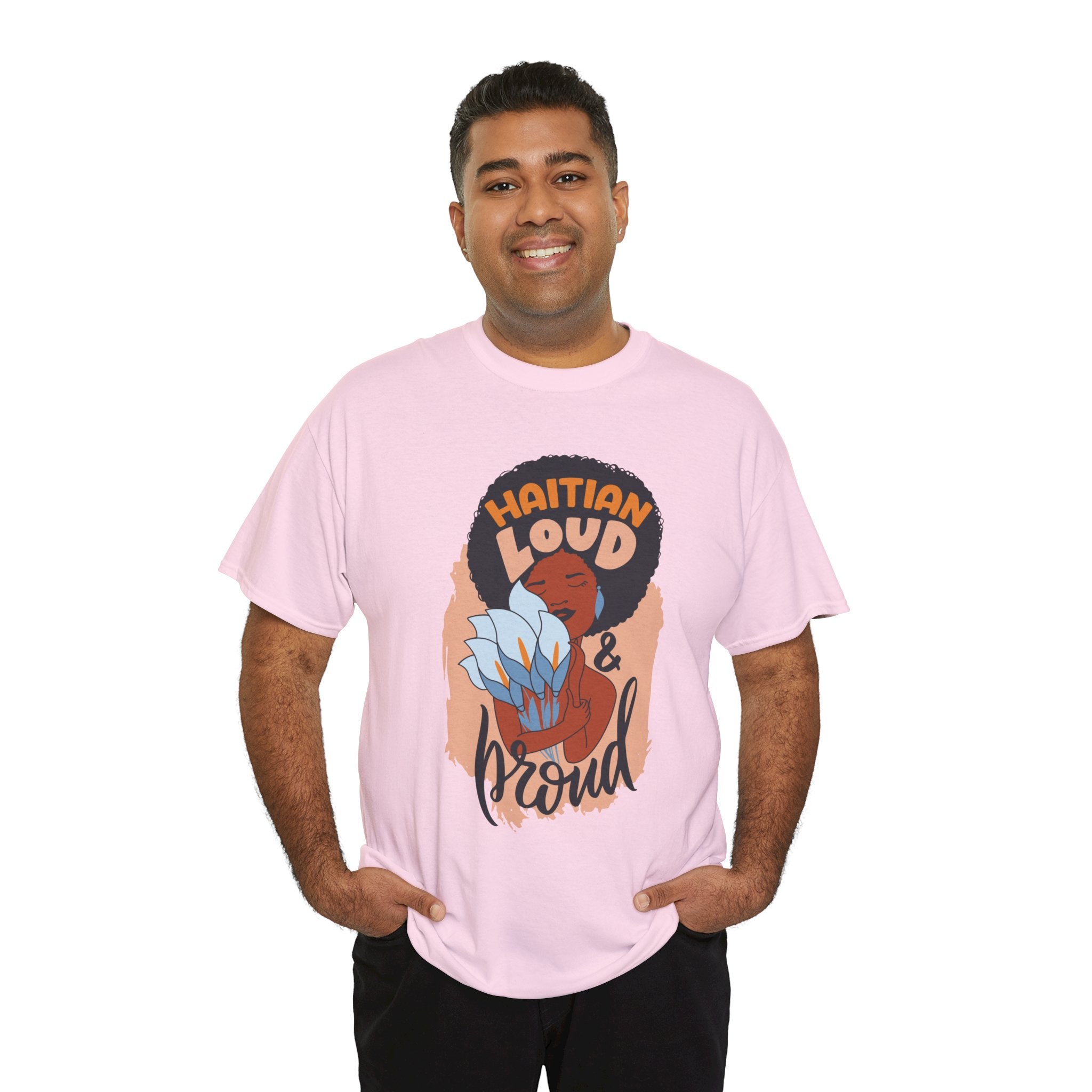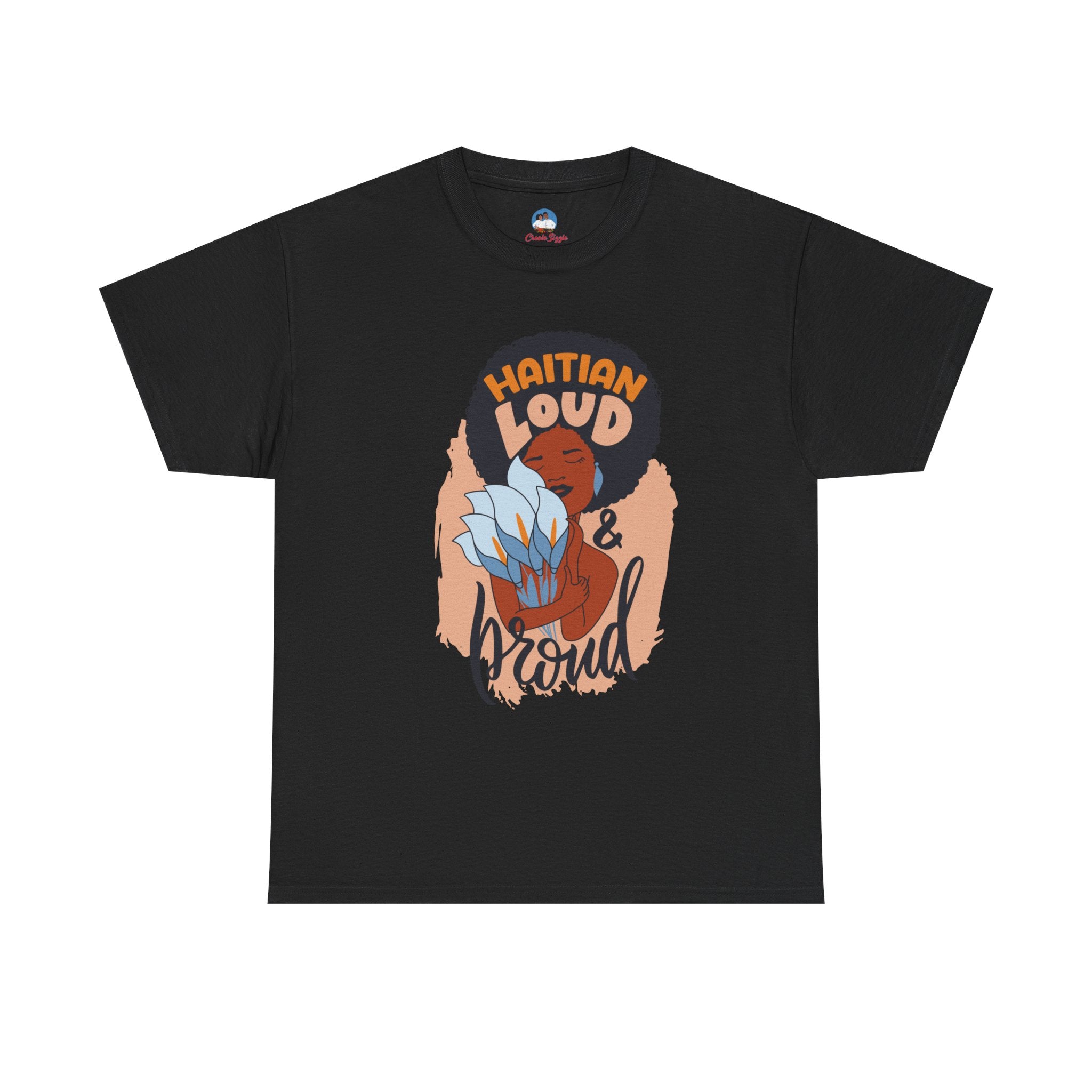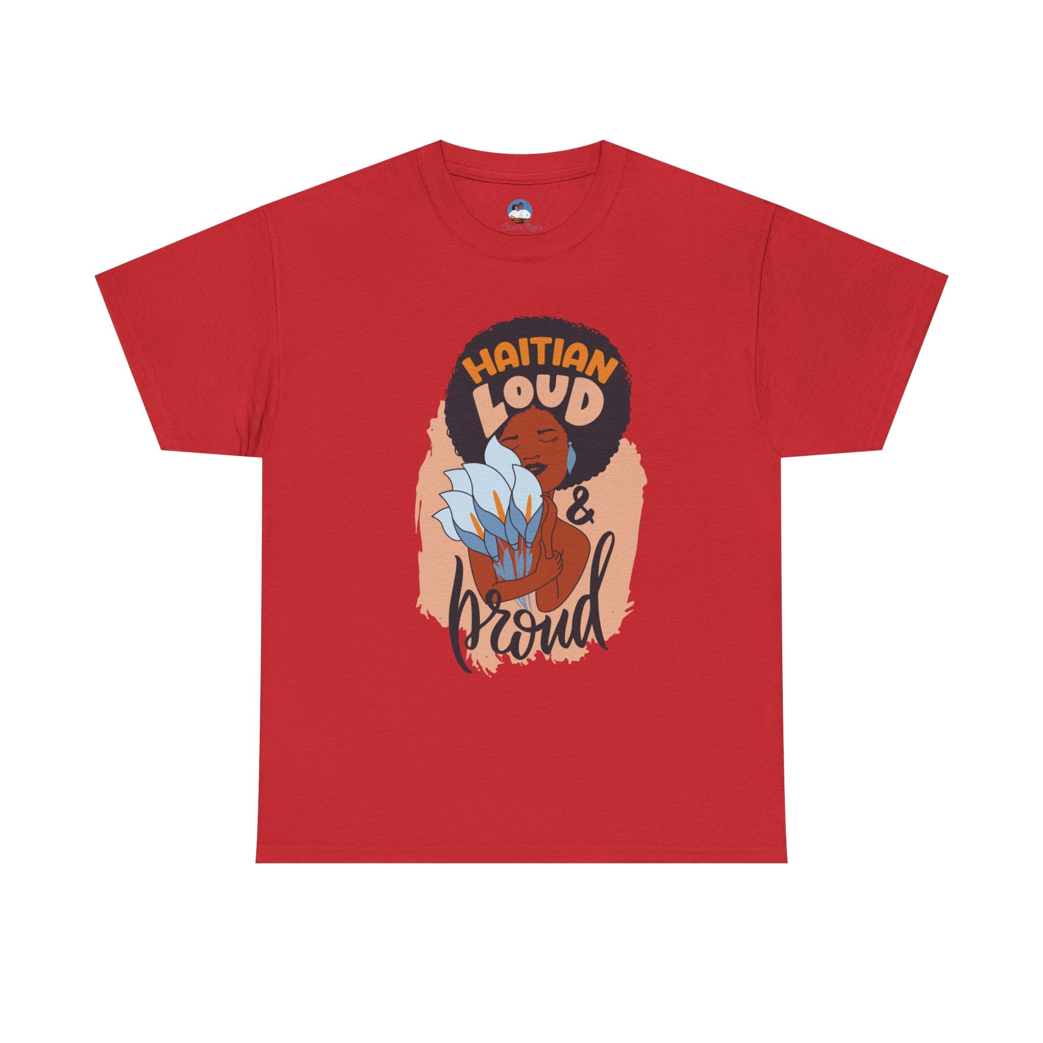 This electrifying design celebrates unapologetic identity and fearless cultural pride. Centered on a striking illustration of a radiant Black woman with natural hair wrapped in a vibrant scarf, clutching a tropical flower close to her heart, the artwork is framed by the powerful words: “Haitian Loud and Proud.” This isn’t just clothing—it’s a proclamation. A tribute to bold femininity, resilience, and heritage that demands to be seen and heard.