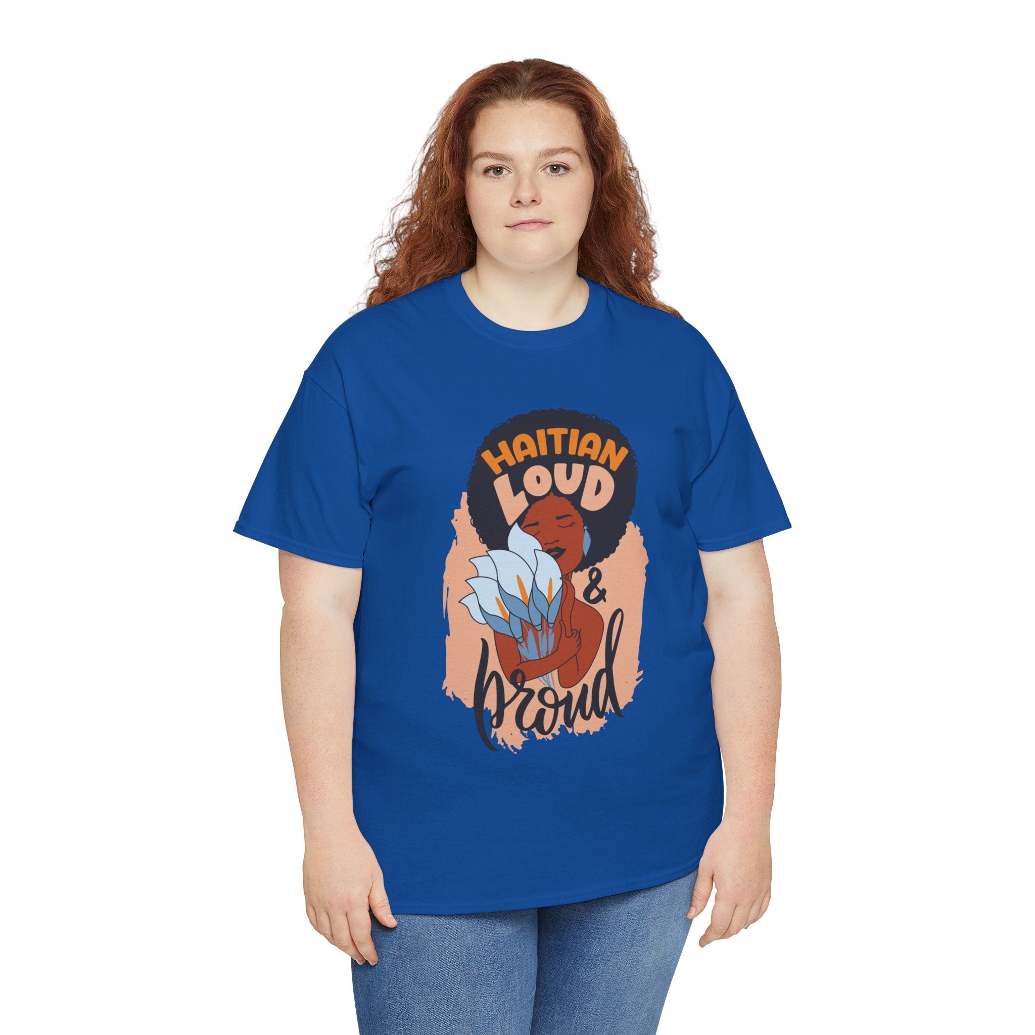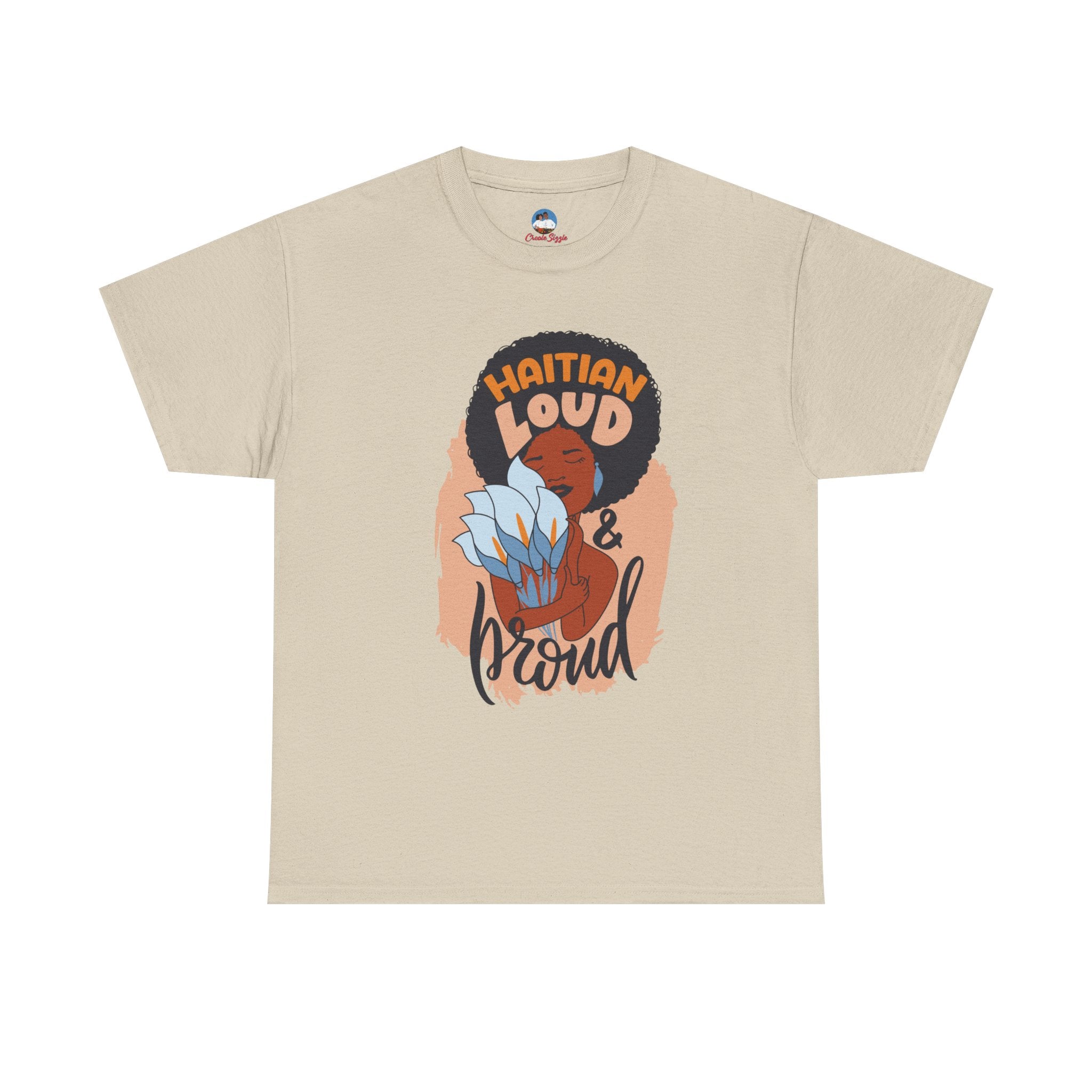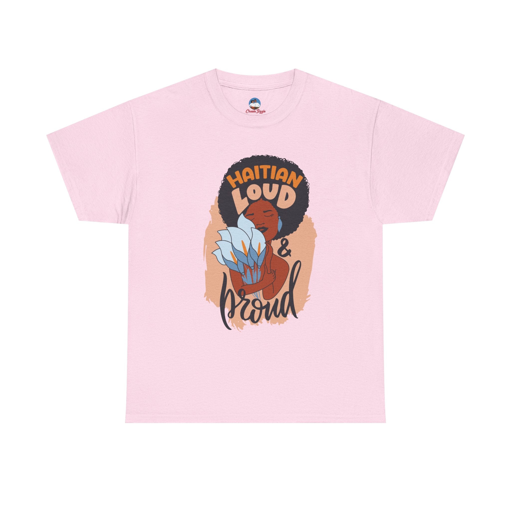This electrifying design celebrates unapologetic identity and fearless cultural pride. Centered on a striking illustration of a radiant Black woman with natural hair wrapped in a vibrant scarf, clutching a tropical flower close to her heart, the artwork is framed by the powerful words: “Haitian Loud and Proud.” This isn’t just clothing—it’s a proclamation. A tribute to bold femininity, resilience, and heritage that demands to be seen and heard.