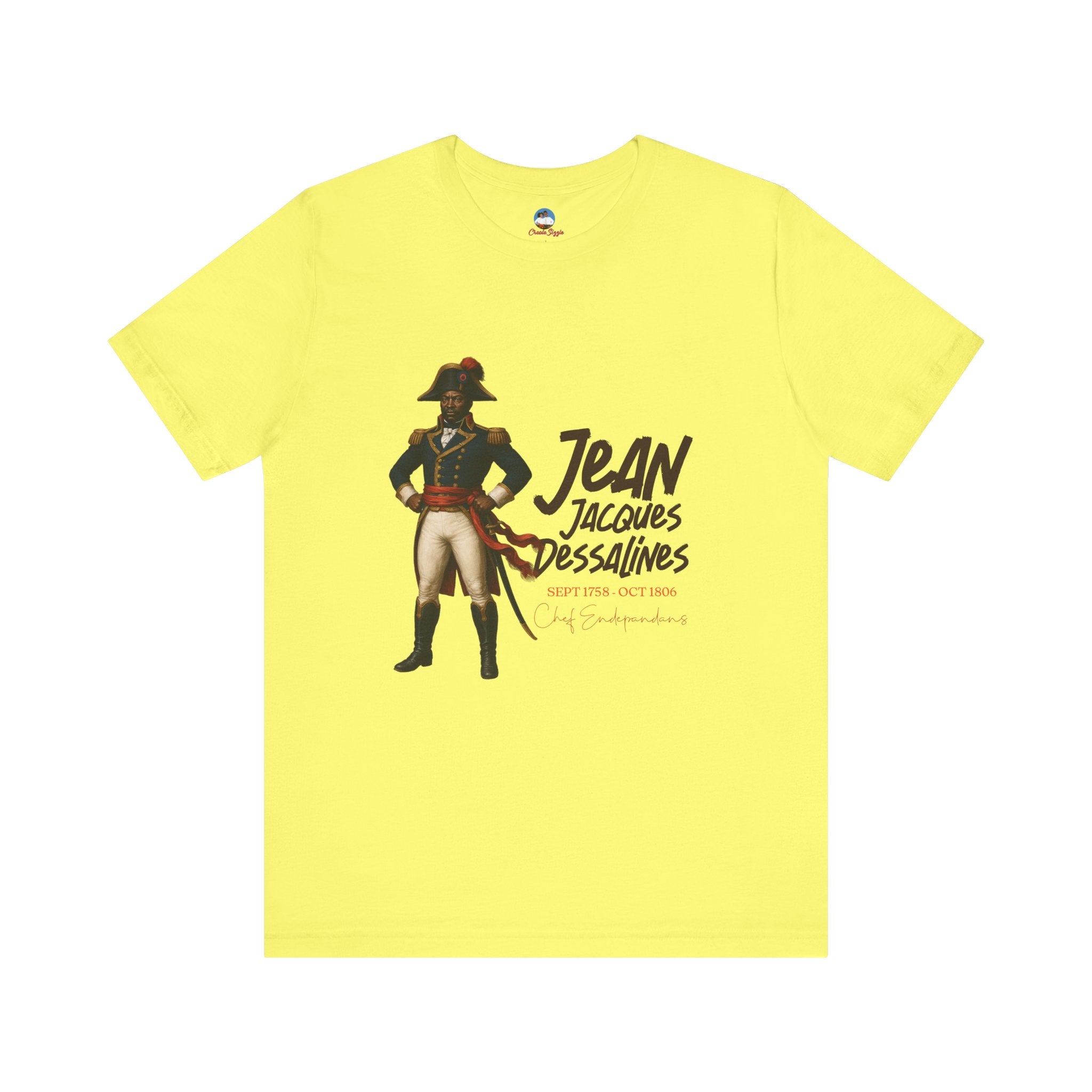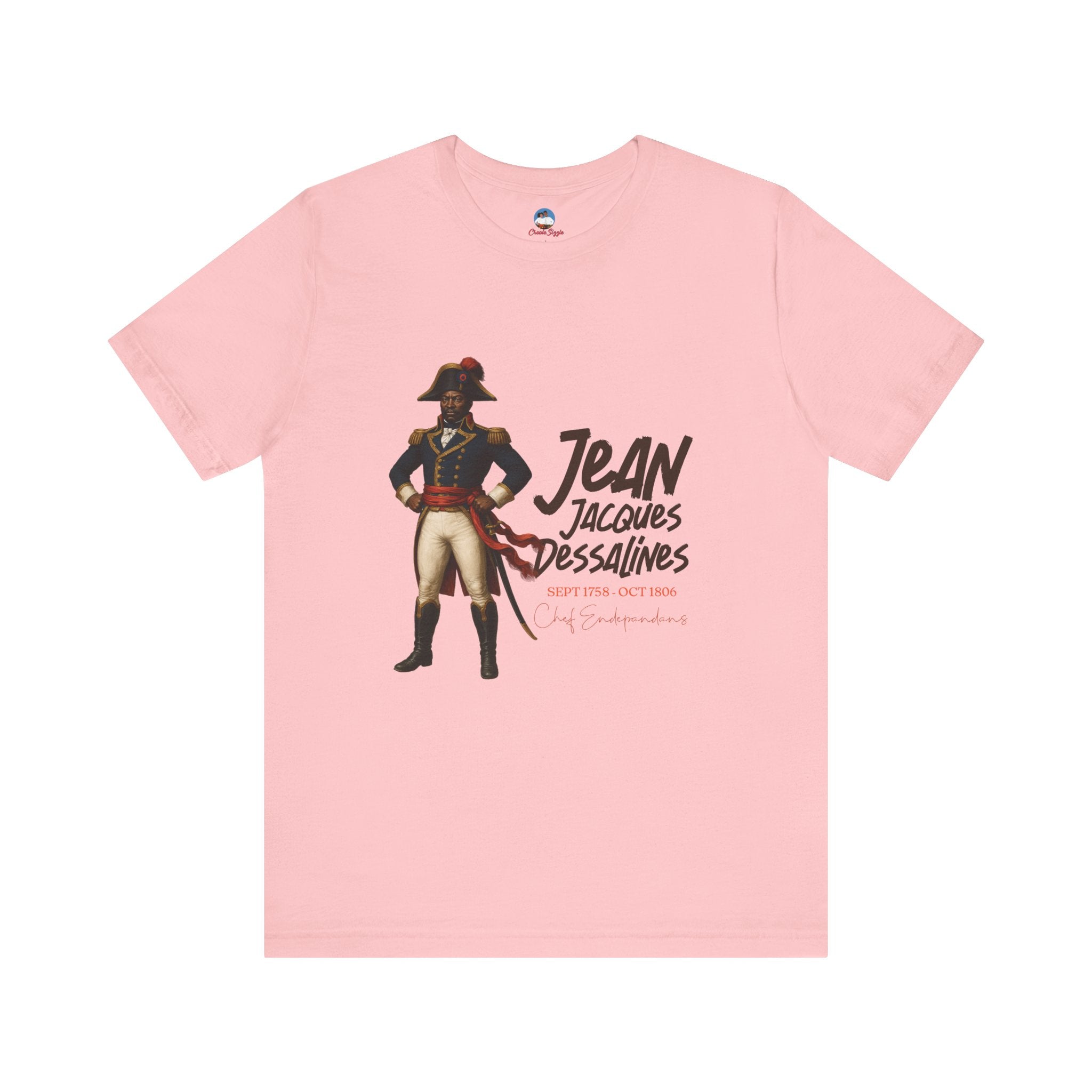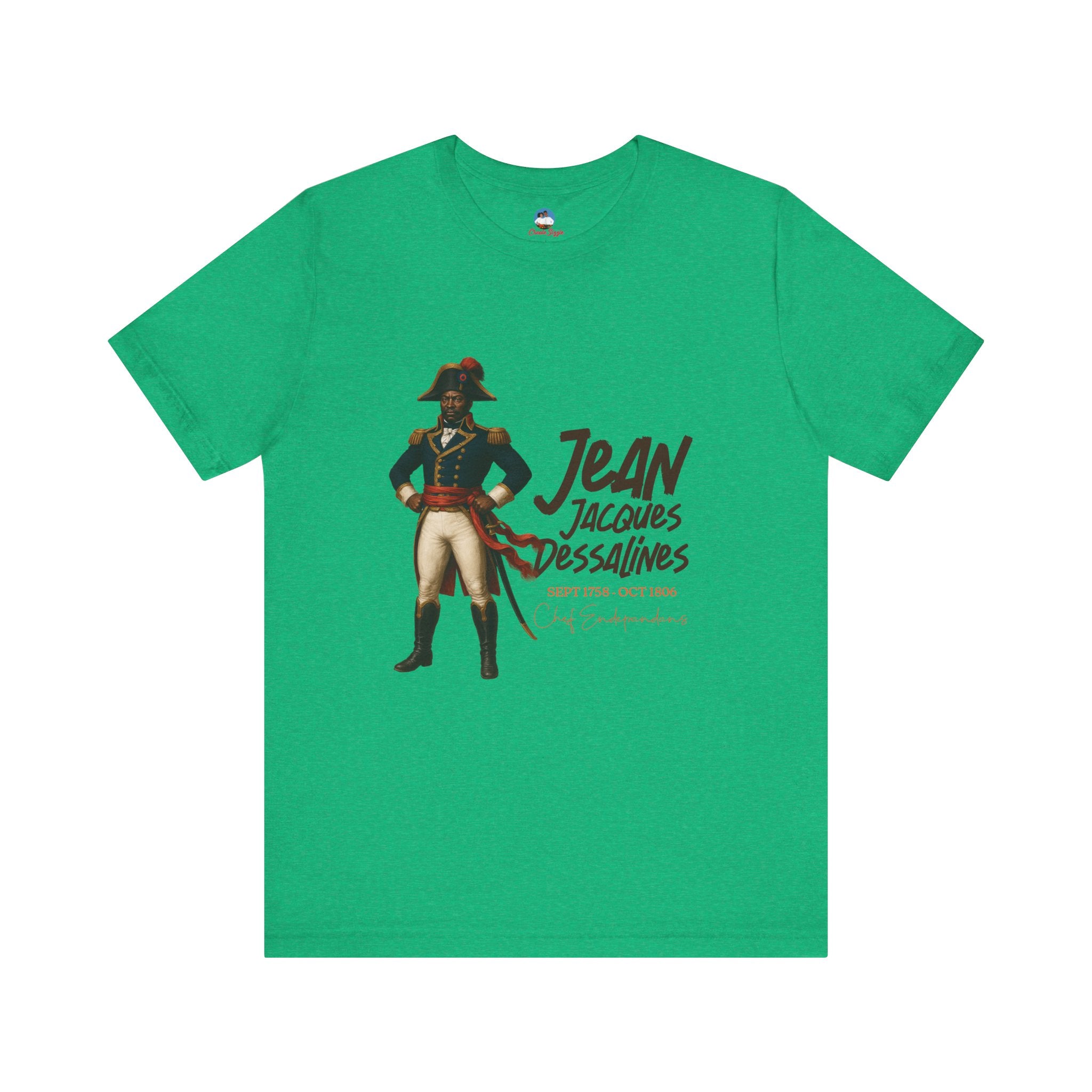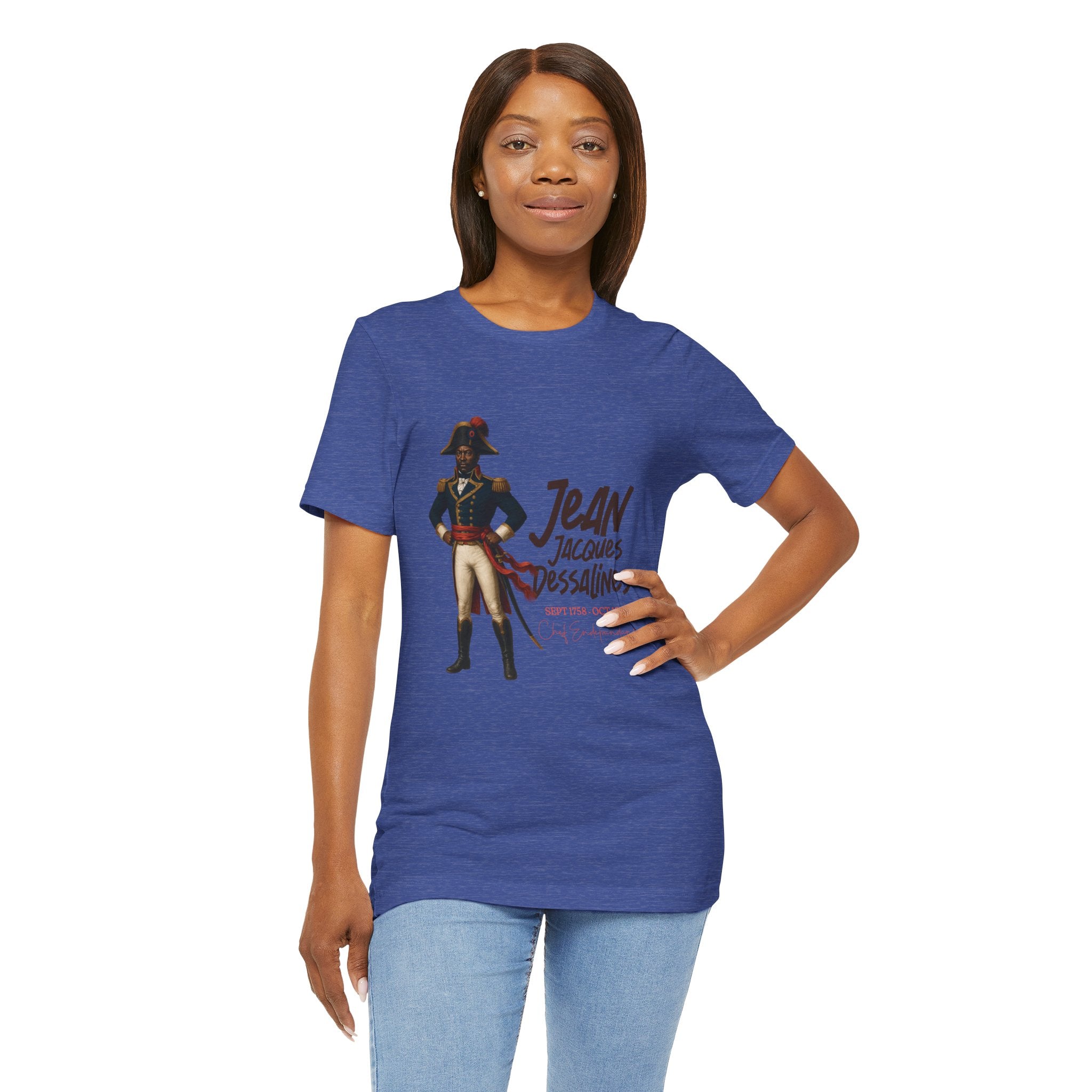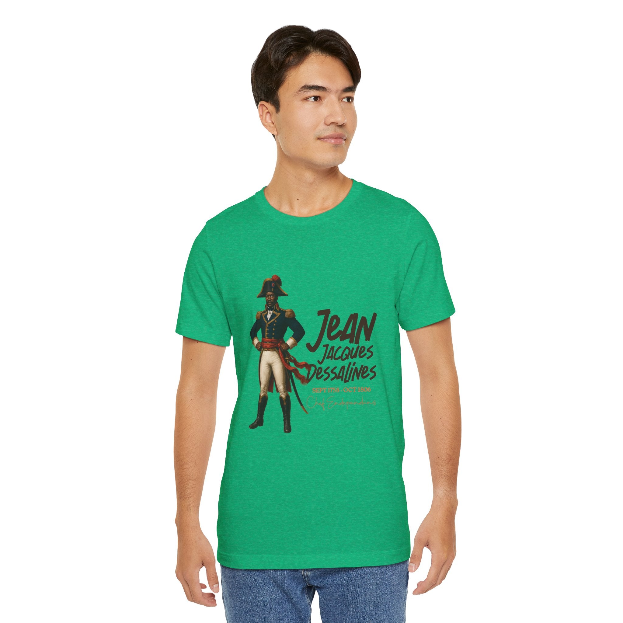 This commanding design captures Jean-Jacques Dessalines in full stride — sword at his side, eyes unflinching, uniform sharp as his resolve. The bold handwritten tribute beneath his image transforms this graphic into more than apparel — it’s a declaration: you descend from the fire that burned down slavery and built freedom. From the battlefields of the Haitian Revolution to the streets you walk today, this piece carries the legacy of no-compromise leadership.