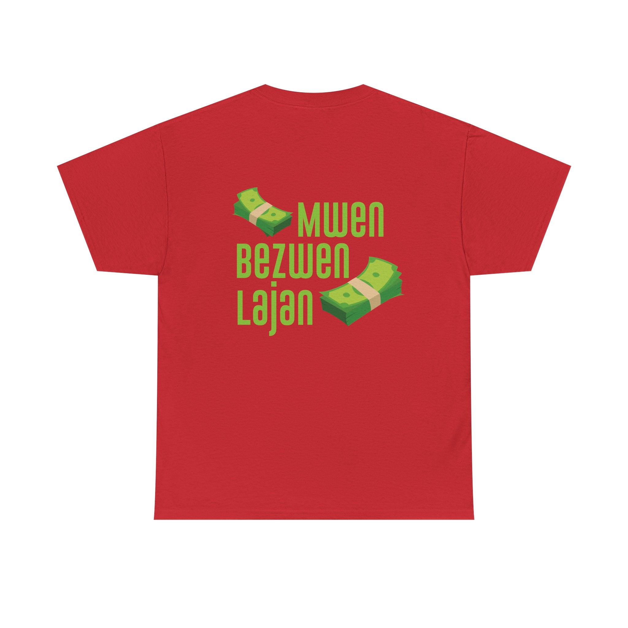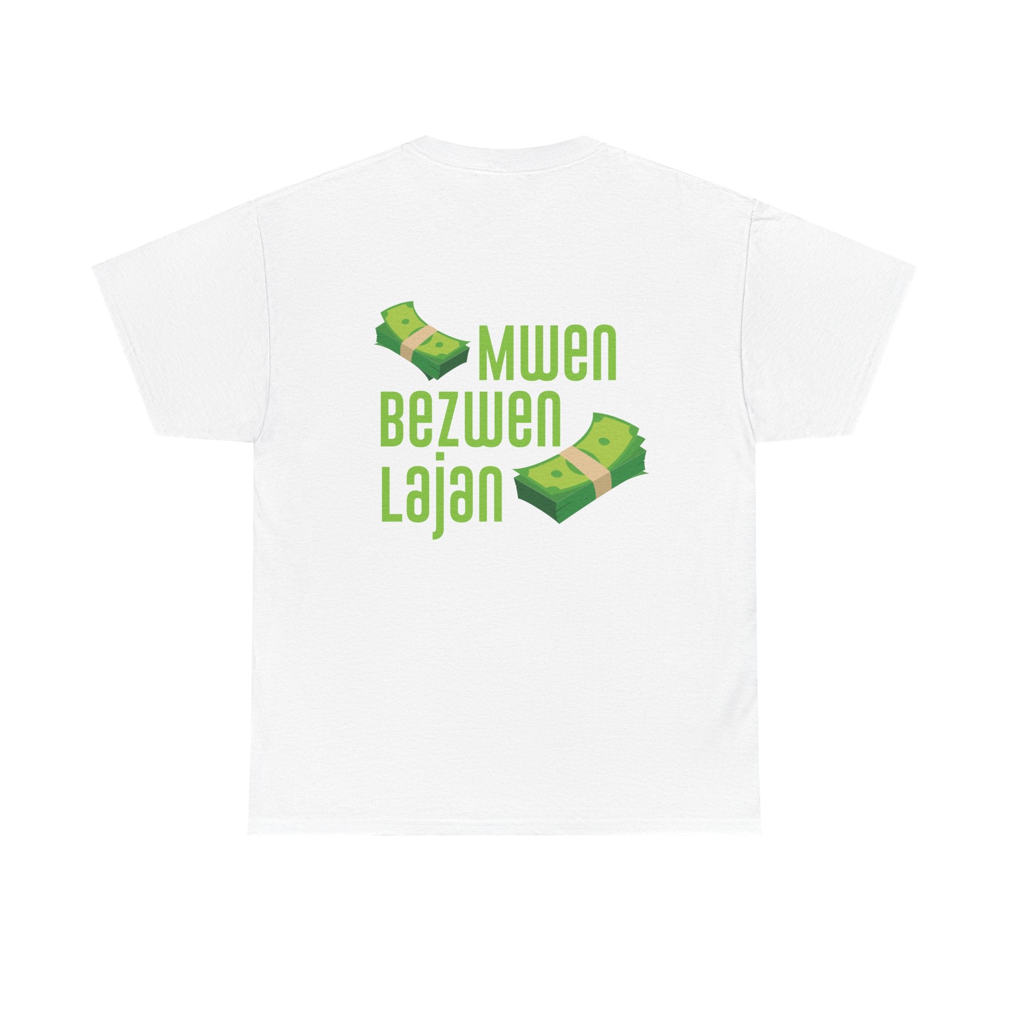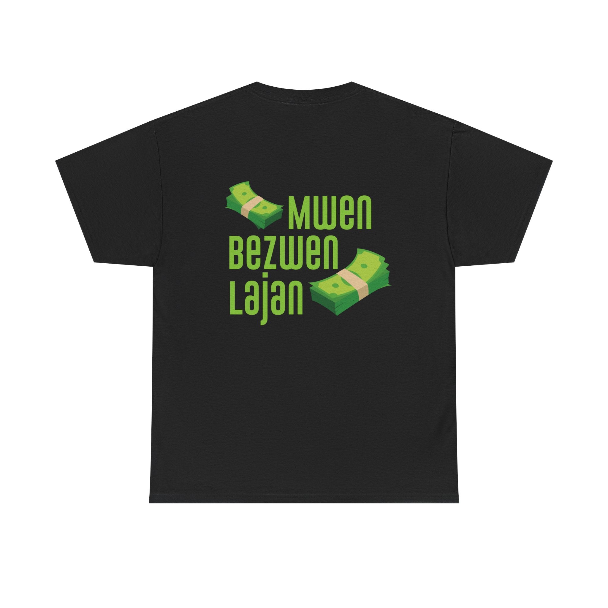 This design speaks in the universal language of hustle: bold Creole script declaring “Mwen Bezwen Lajan” (I need money), paired with floating stacks of cash. It’s humorous, real, and unapologetically Haitian. In a world where survival is a daily negotiation, this tee is a nod to those who push forward with ambition and wit. Lighthearted but culturally sharp, it reflects a truth shared across the diaspora — the grind never stops.