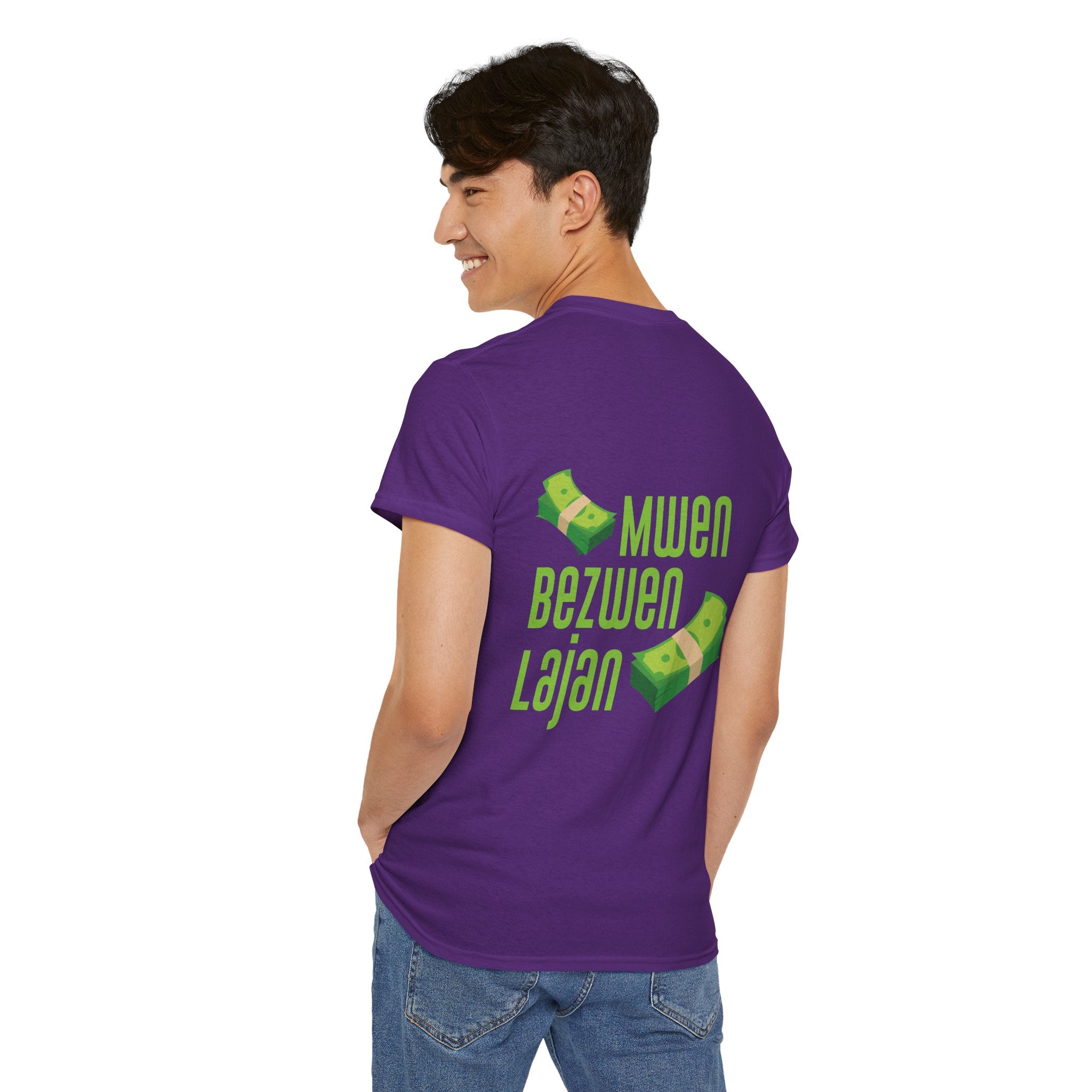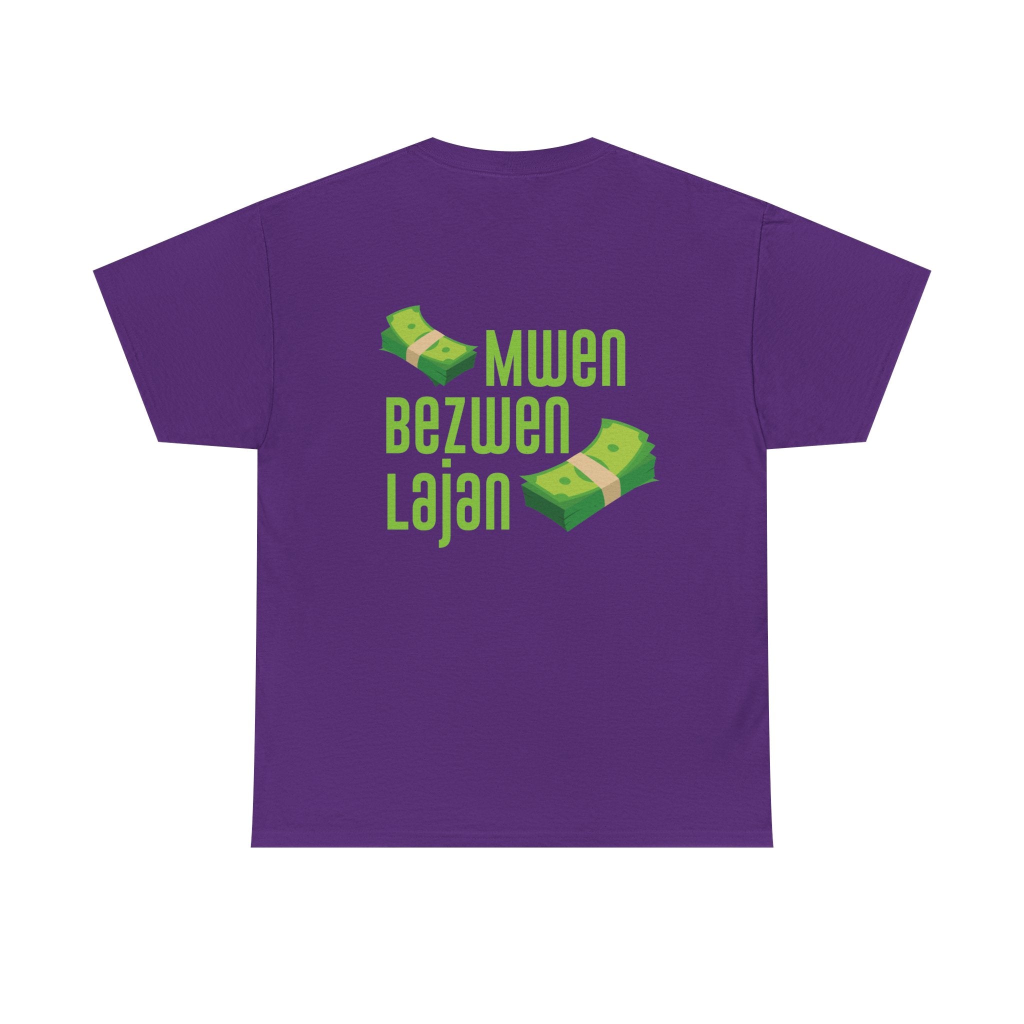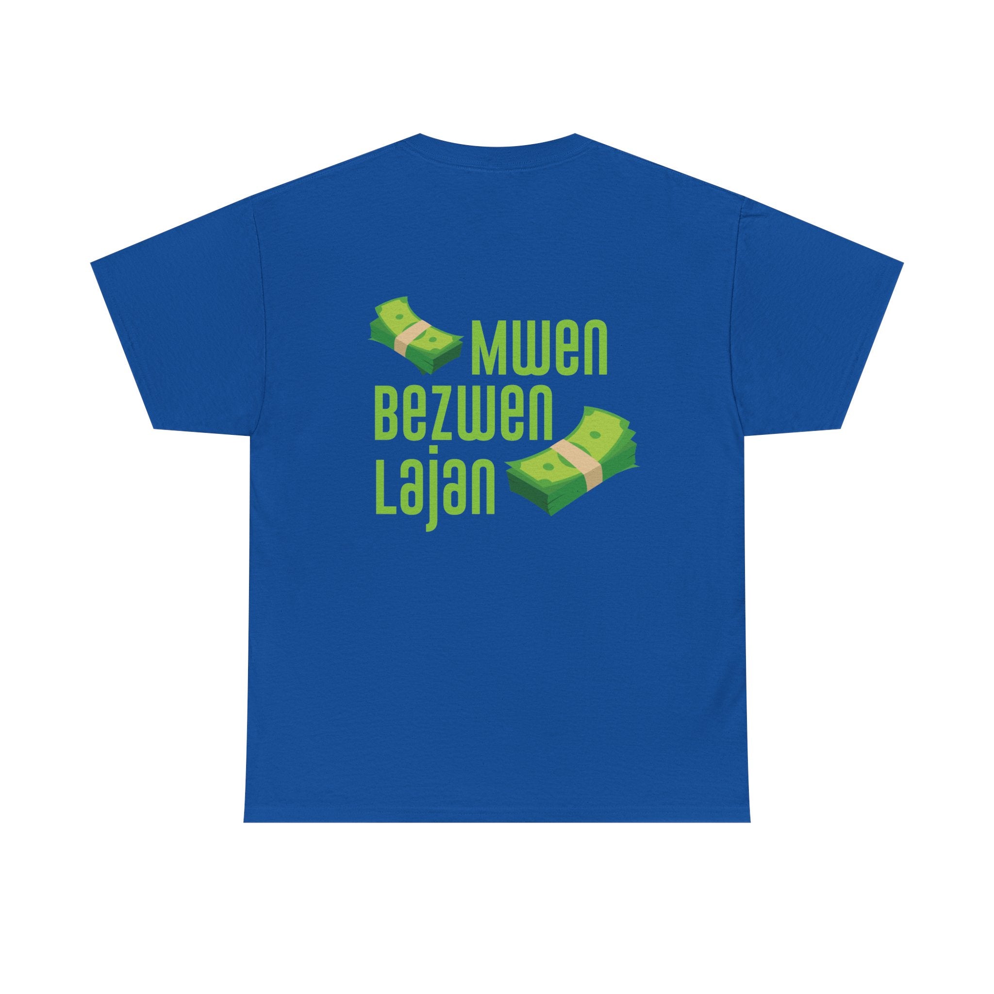 This design speaks in the universal language of hustle: bold Creole script declaring “Mwen Bezwen Lajan” (I need money), paired with floating stacks of cash. It’s humorous, real, and unapologetically Haitian. In a world where survival is a daily negotiation, this tee is a nod to those who push forward with ambition and wit. Lighthearted but culturally sharp, it reflects a truth shared across the diaspora — the grind never stops.