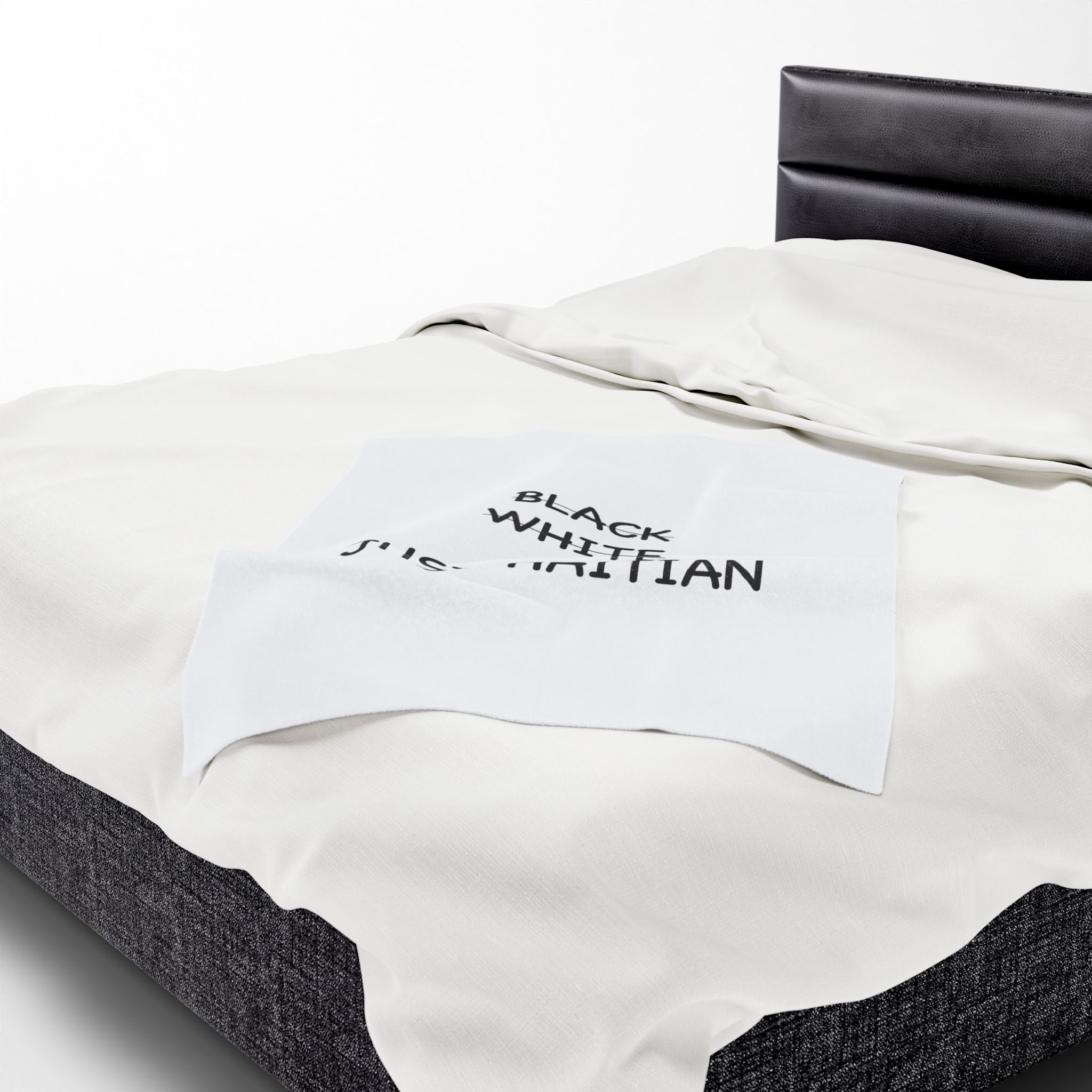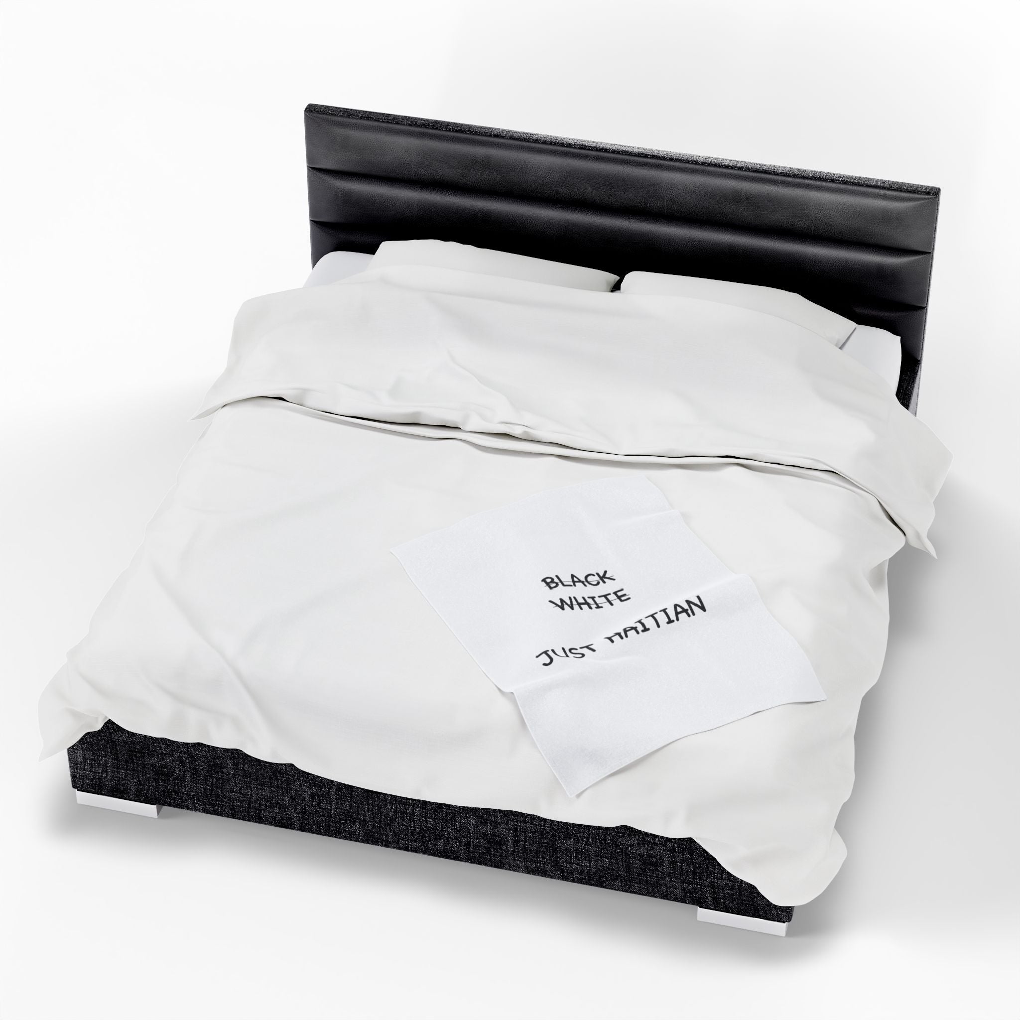 Clean, bold typography carries a powerful declaration: “Black. White. Just Haitian.” This is more than a blanket — it’s a statement of unity, identity, and pride. In a nation as rich and diverse as Haiti, where skin tones vary but the heart beats the same, this piece challenges colorism and reaffirms our shared heritage.