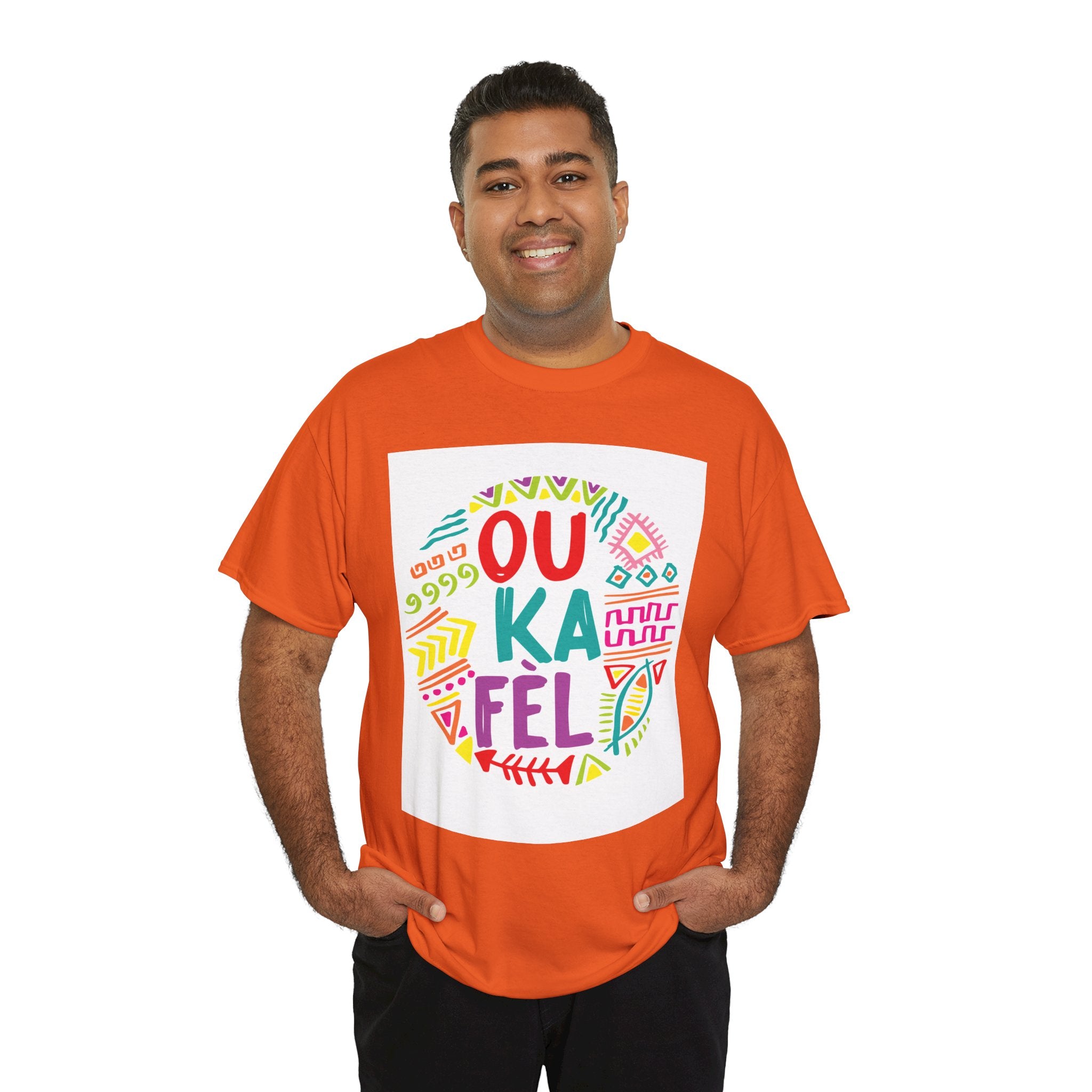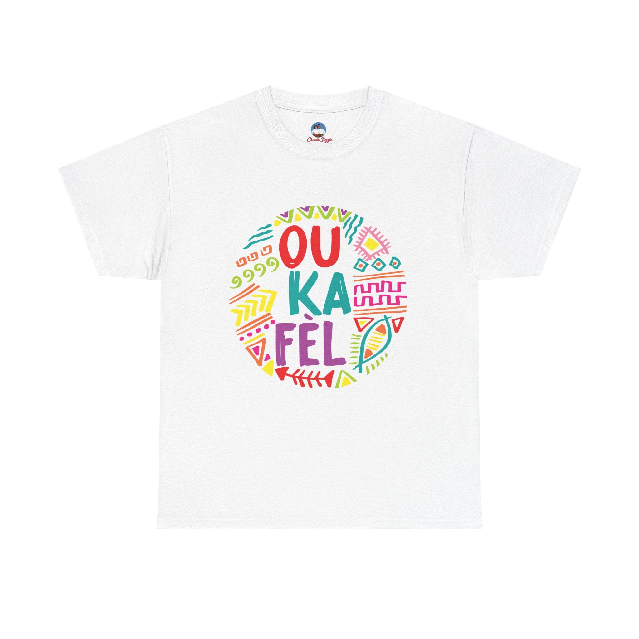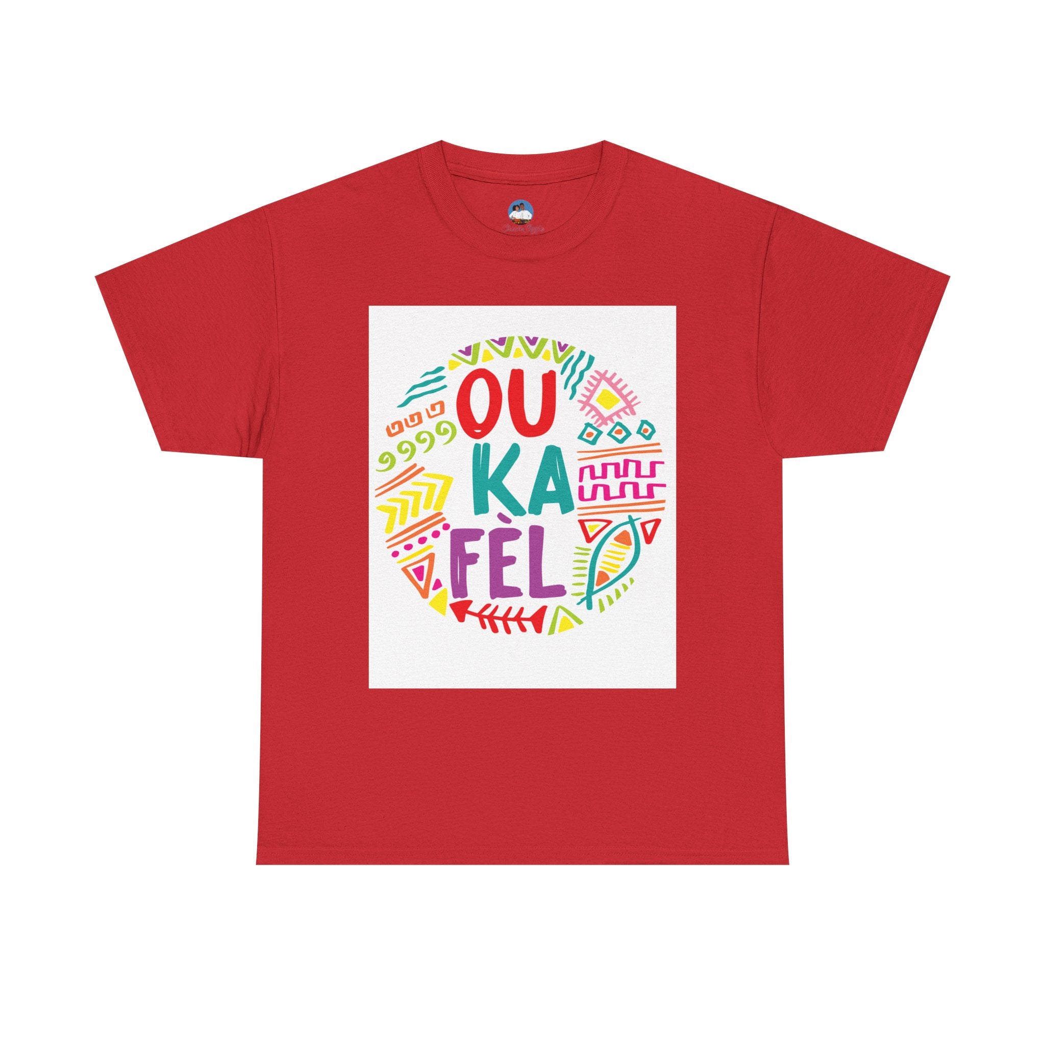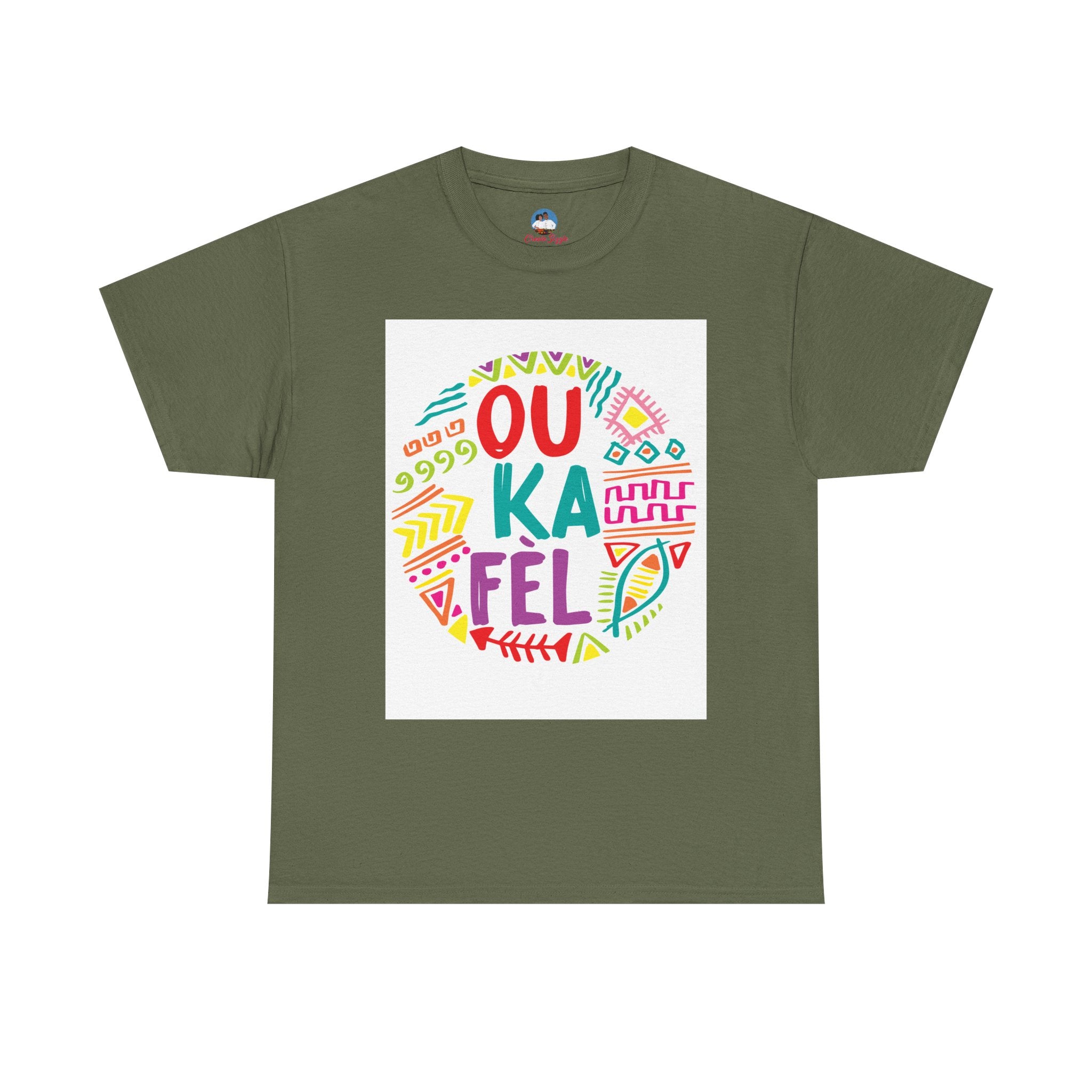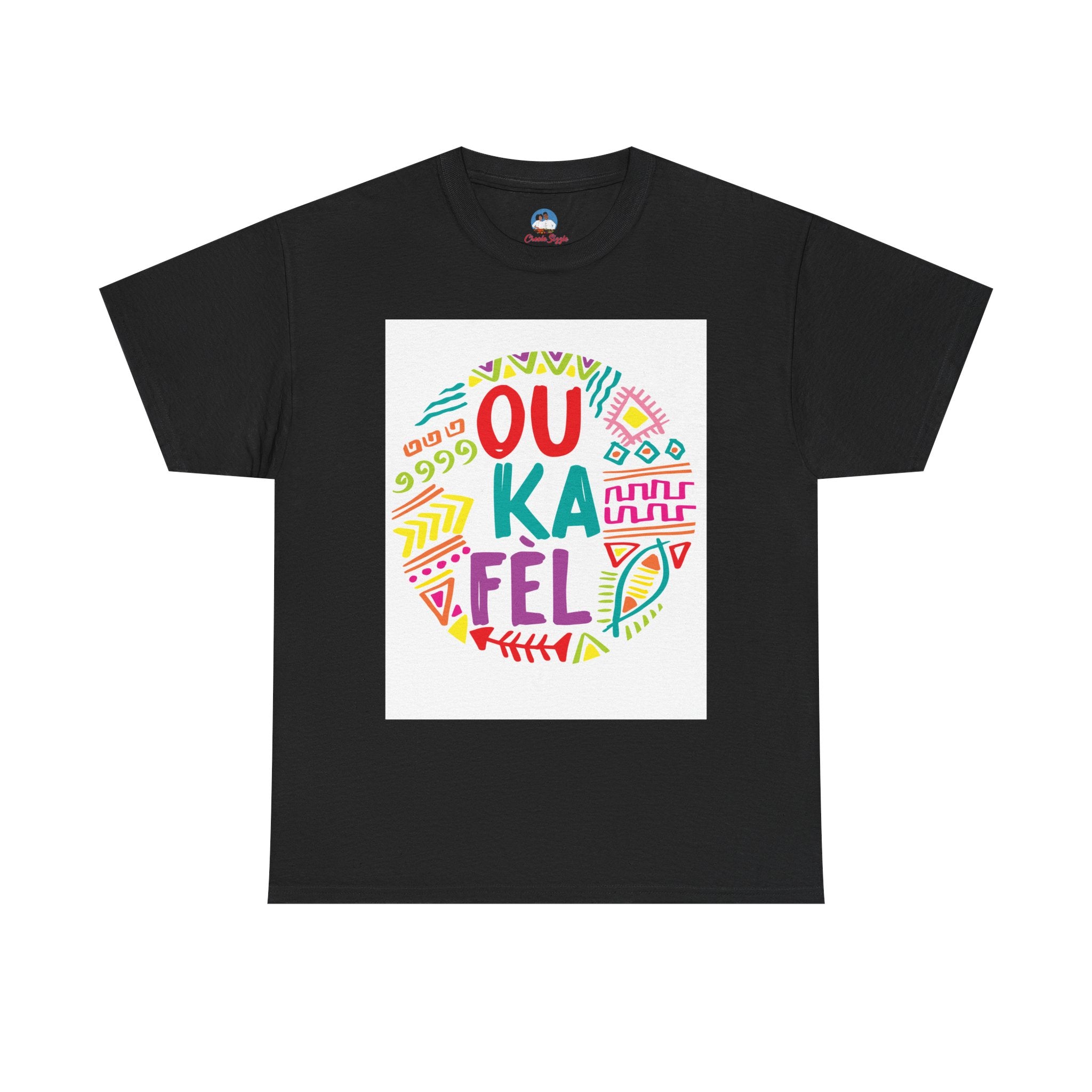 “You can do it.” This design brings the heartbeat of Haitian resilience into bold, colorful typography — “Ou Ka Fè’l,” a Creole phrase echoing from kitchen tables, community gatherings, and the voices of elders pushing us forward. It’s encouragement you can wear — an everyday affirmation stitched into premium cotton.