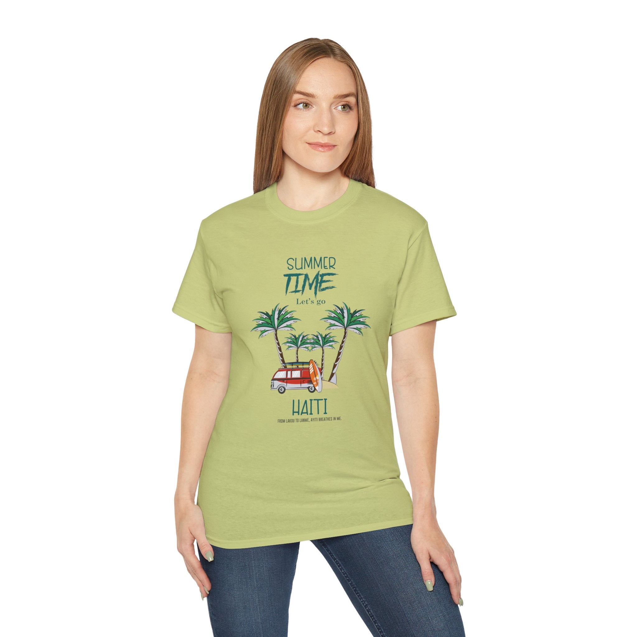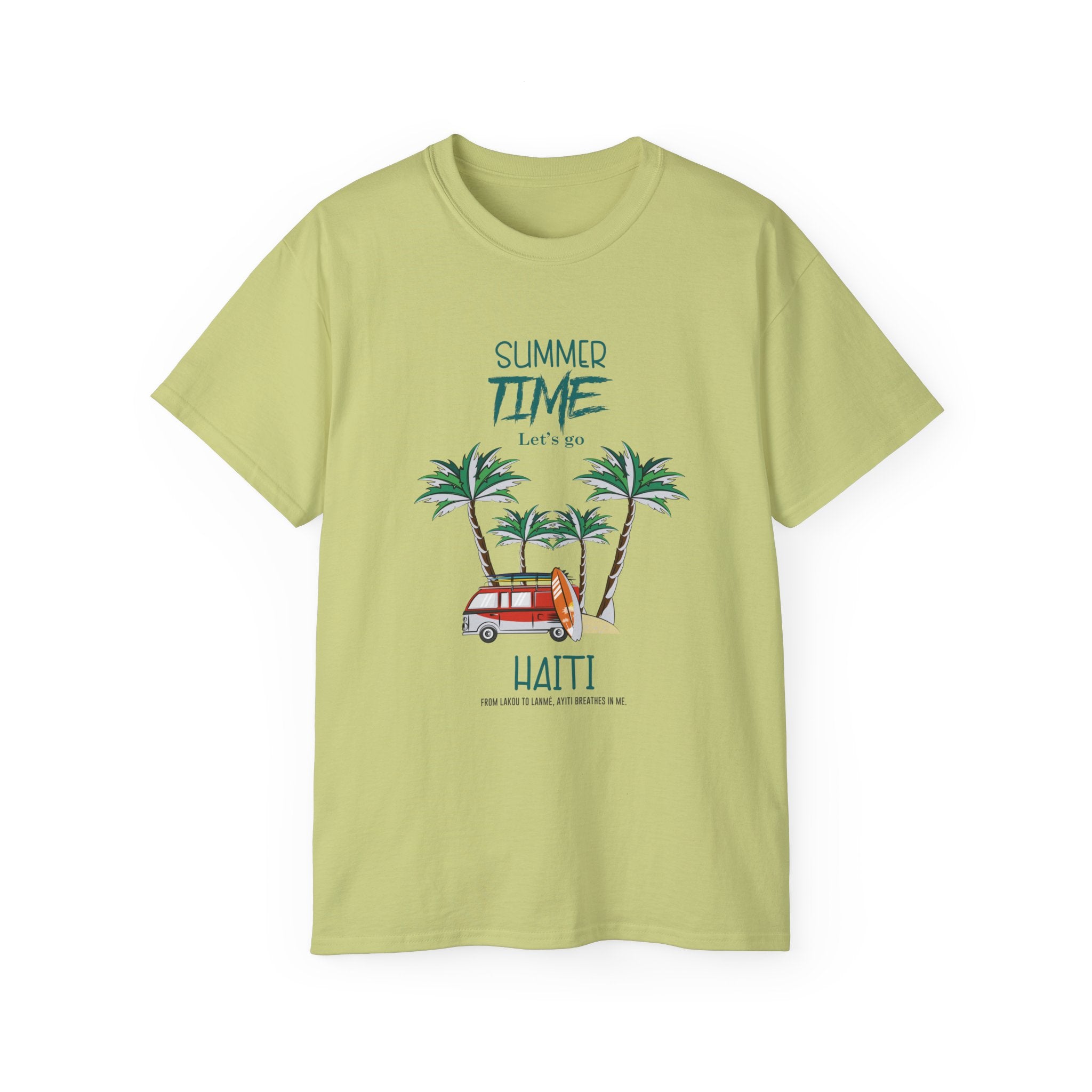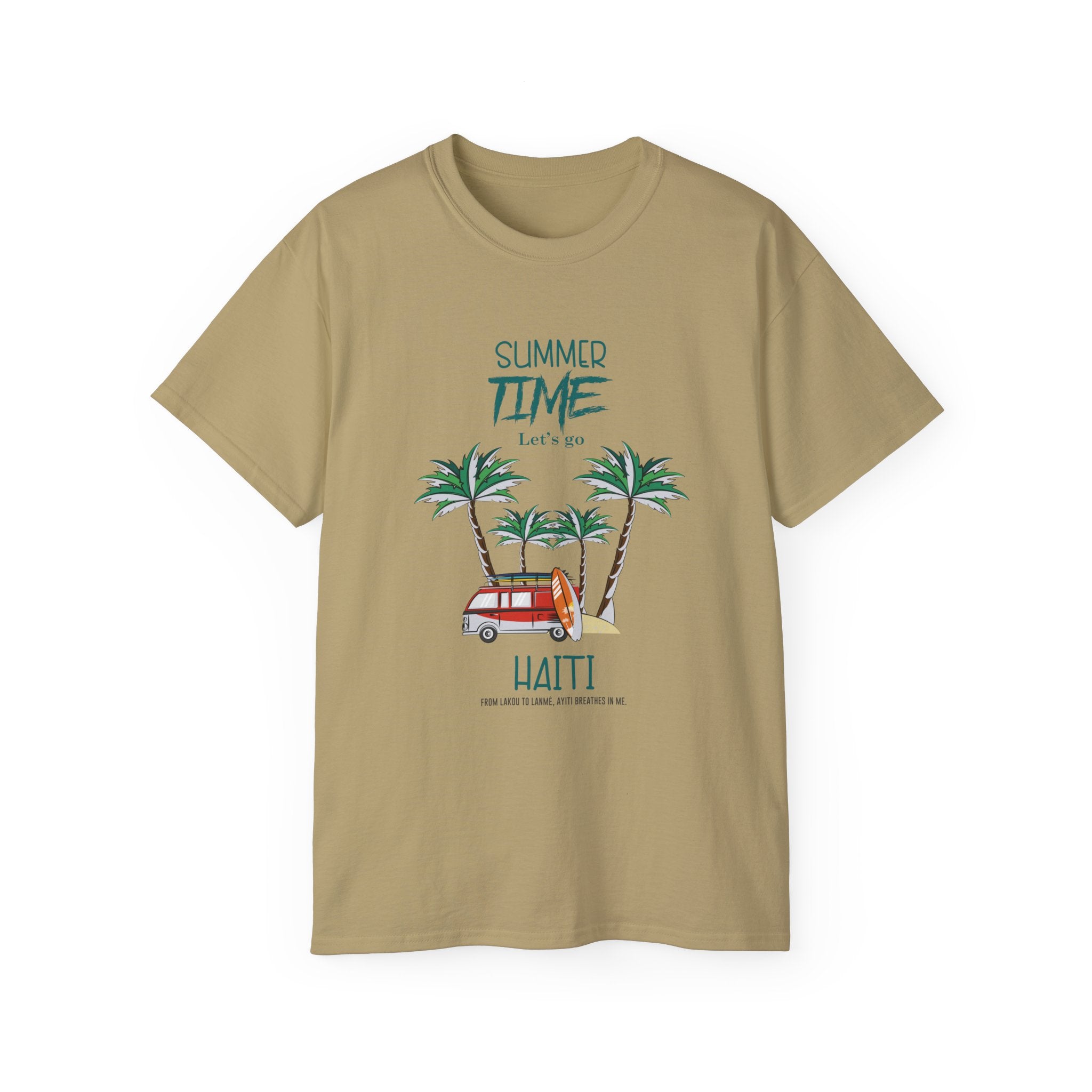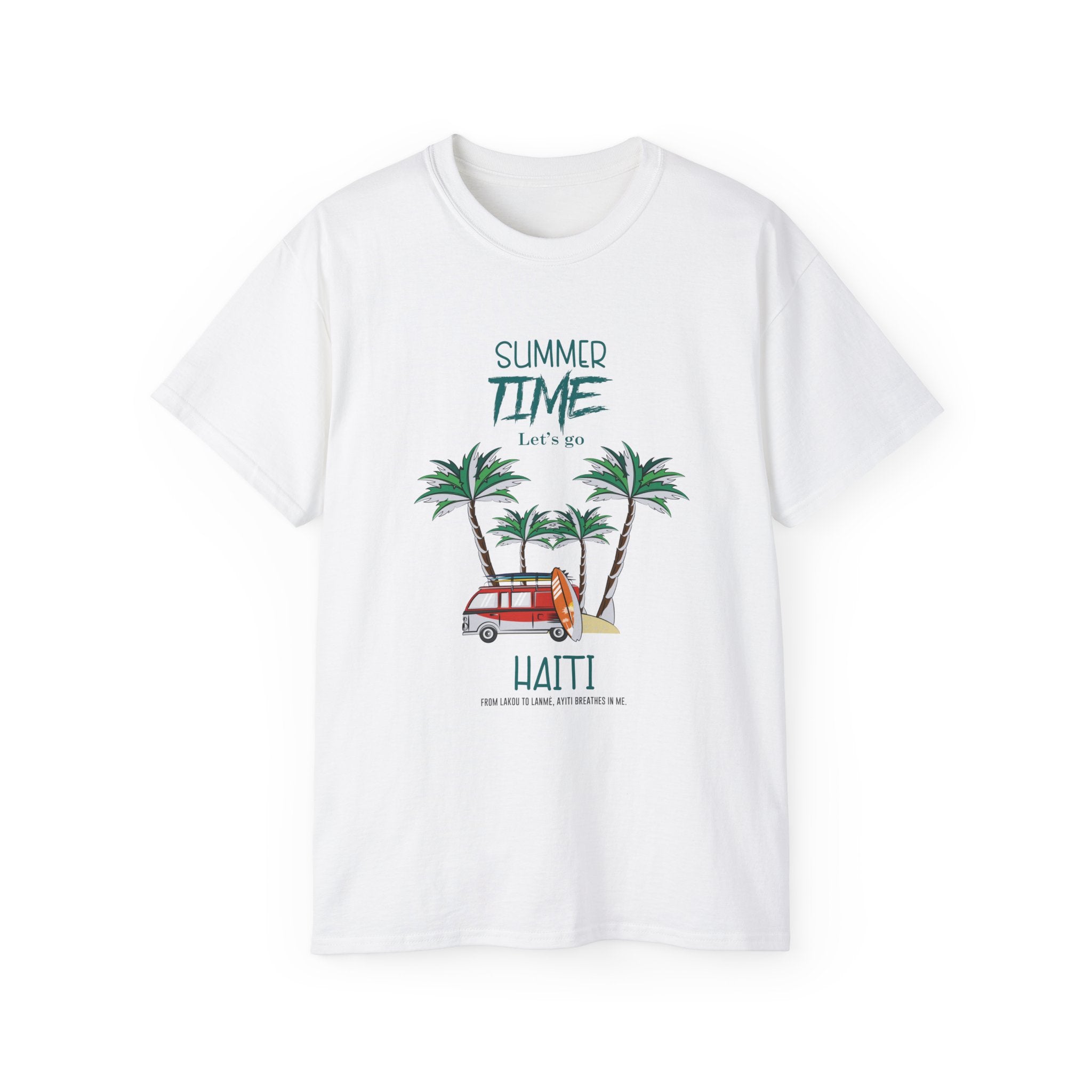 This tee brings the Caribbean’s vibrant spirit into your everyday style with a playful graphic of palm trees, golden sunshine, and a nostalgic Haitian tap-tap van. Overlaid with the phrase “Summer Time – Haiti”, it’s more than a vacation shirt — it’s a celebration of resilience, joy, and freedom under the Caribbean sun.